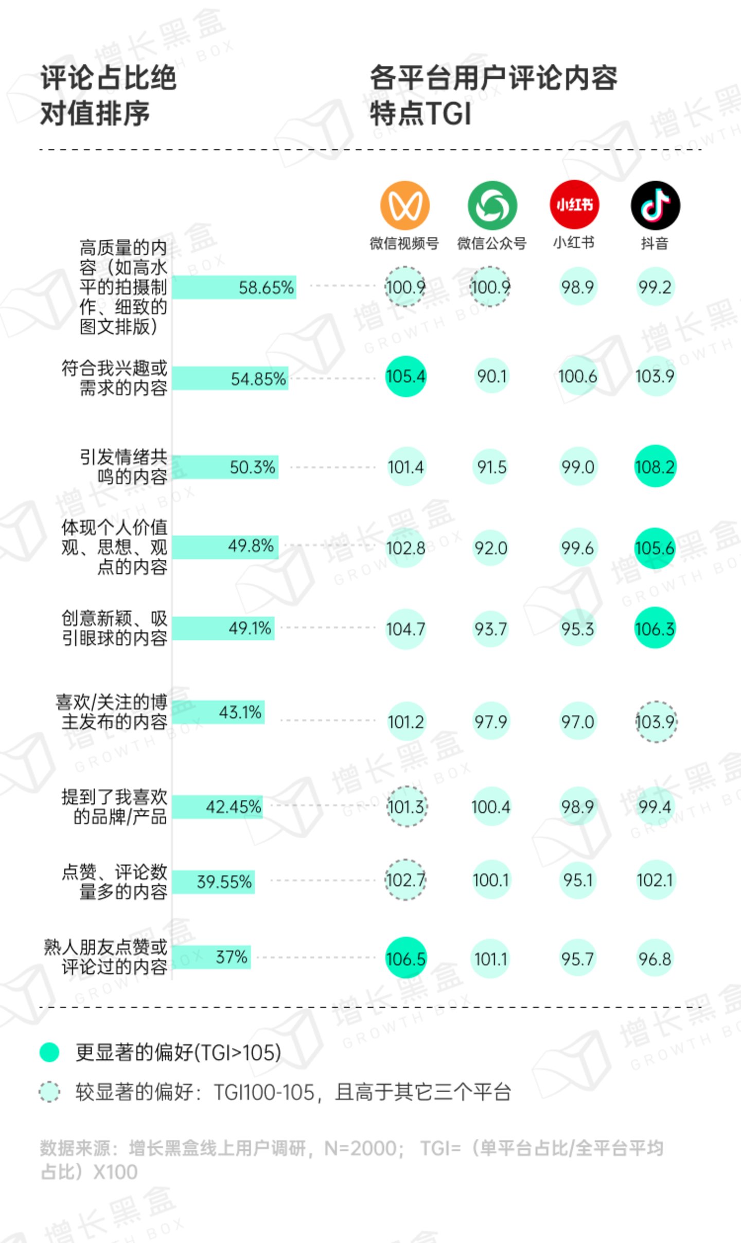 对于视频号来说:内容质量上升+符合兴趣偏好的因素非常显著,说明视频号在内容供给的提升力度更强;评论区的氛围也很重要,说明熟人社交能带来更好的讨论环境