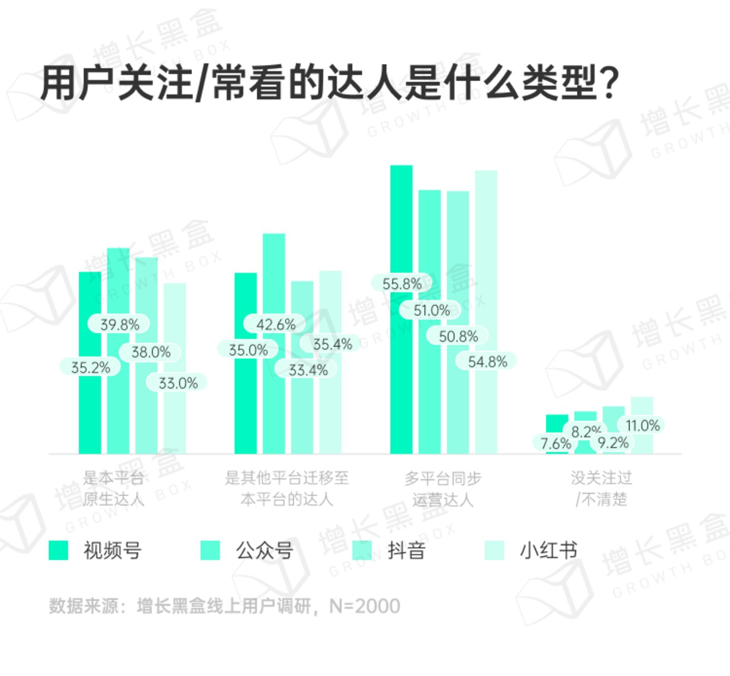 有最高比例的用户会关注多平台同步运营达人(达人在多个平台上都有账号,且同步更新和活跃)。