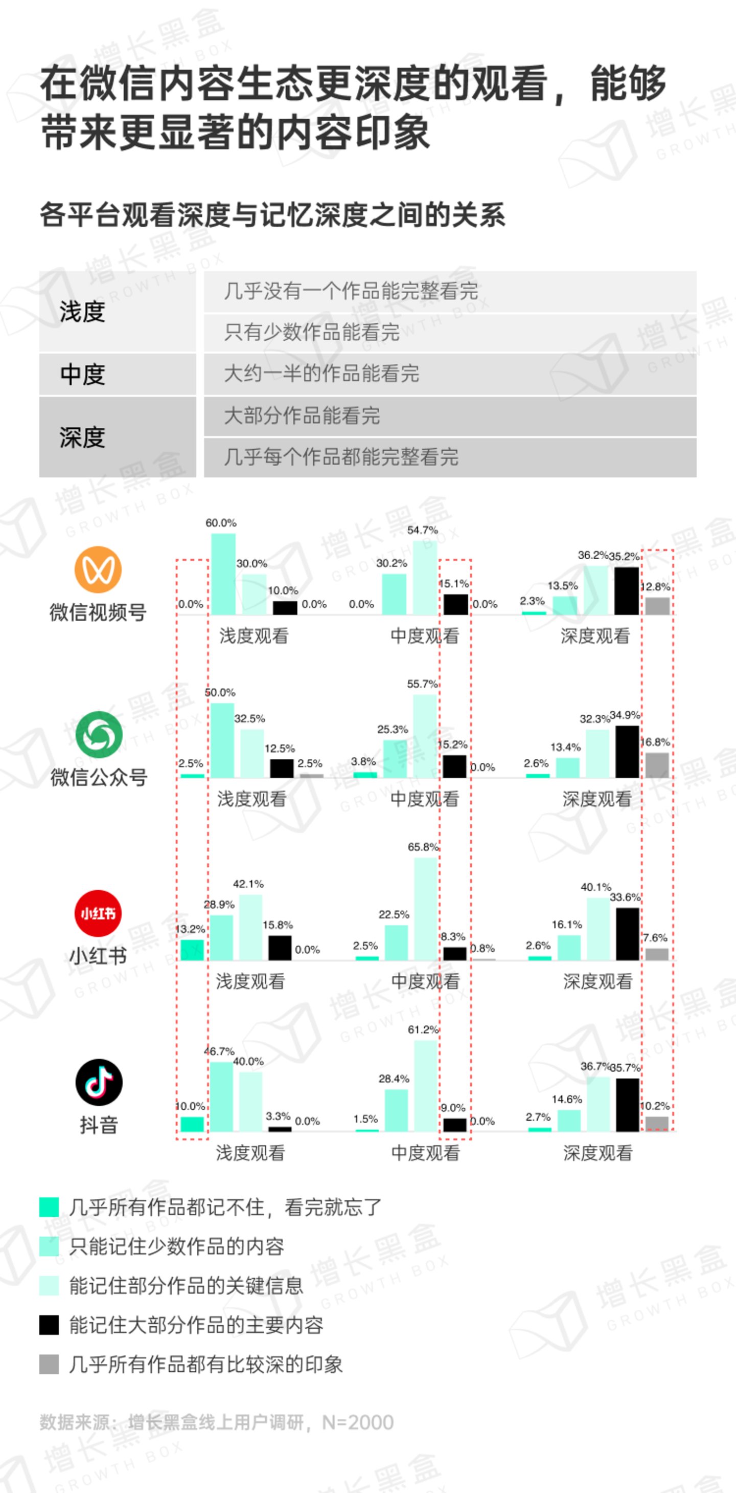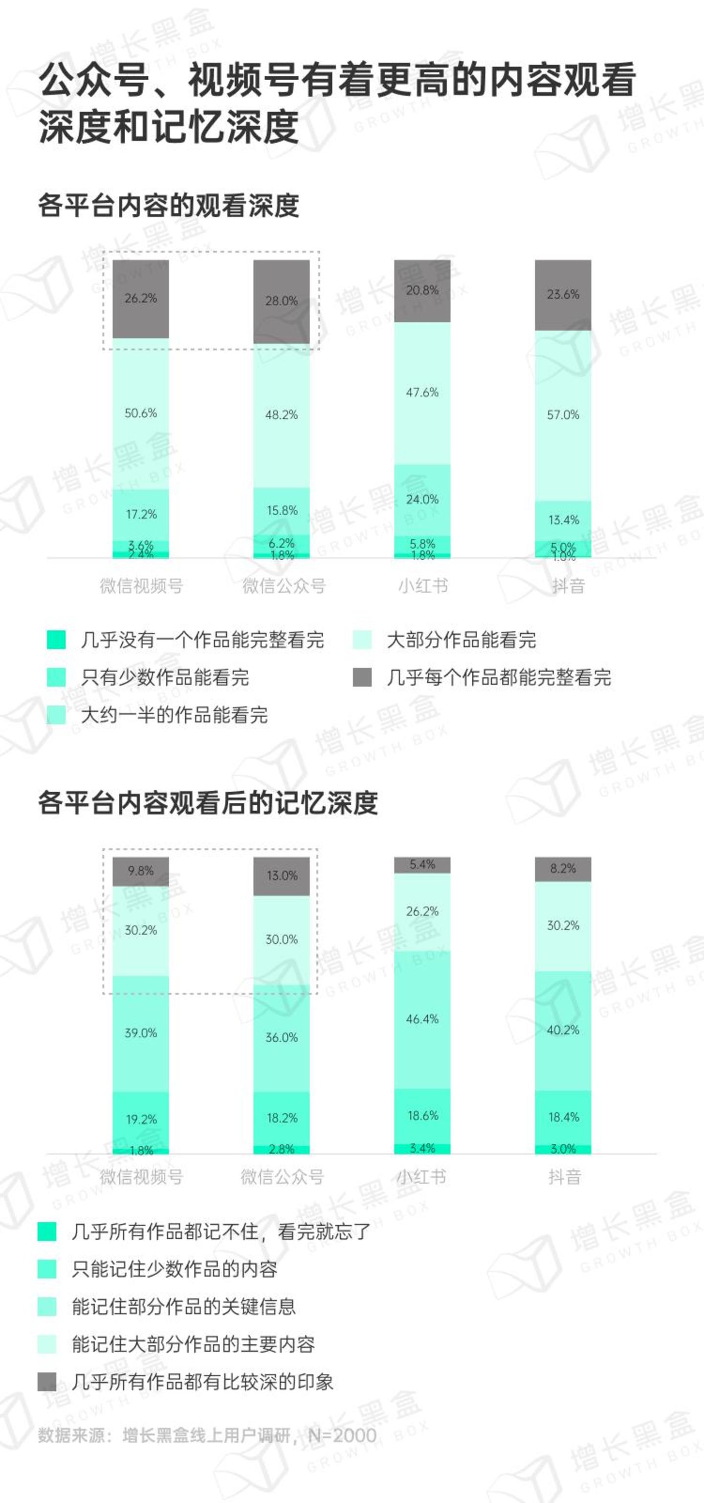 公众号在记忆深度上表现是最突出的,能记住大部分作品主要内容和几乎所有作品都有较深印象的用户比例是全平台最高。