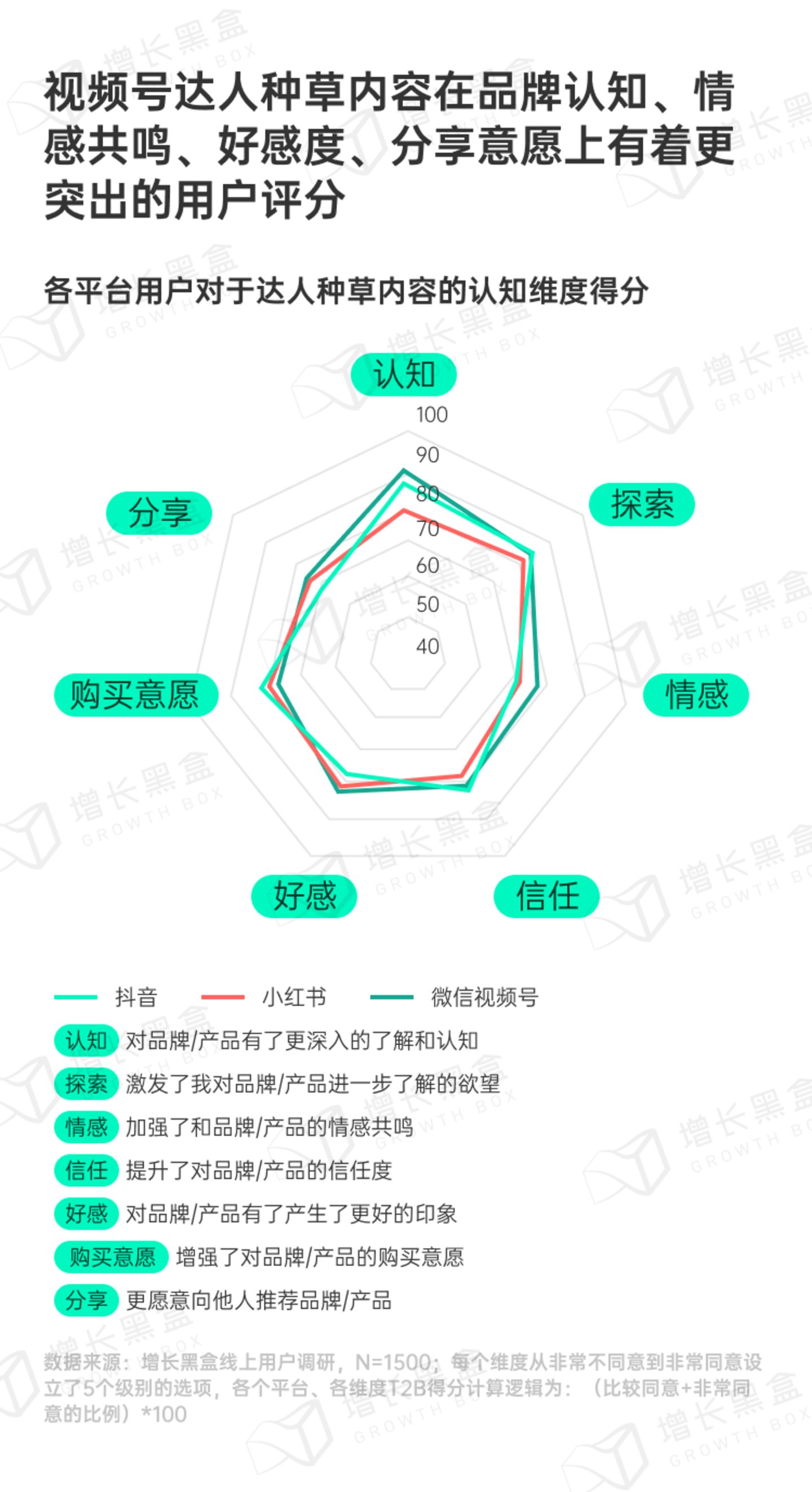 我们将各平台达人种草认知分为七个维度,并根据用户选择的情况进行了聚合评分。视频号种草内容在品牌认知、情感共鸣、好感度和产品分享等四方面得分均为全平台最高。这说明深度观看和记忆,对于种草效果有着积极的影响,用户普遍认为视频号是一个高质量的种草内容平台。