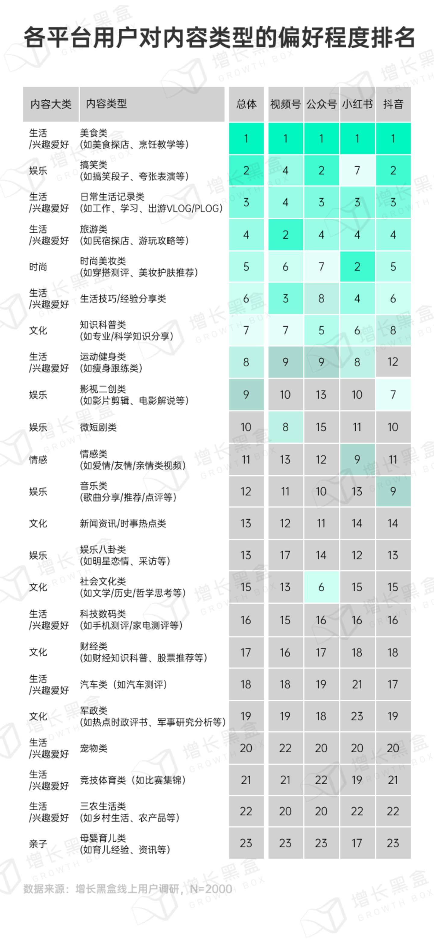 我们按照主流定义,对于具体的达人创作内容类型进行了区分,并根据用户偏好程度对于各个平台进行了排名(详细分类见附录)。