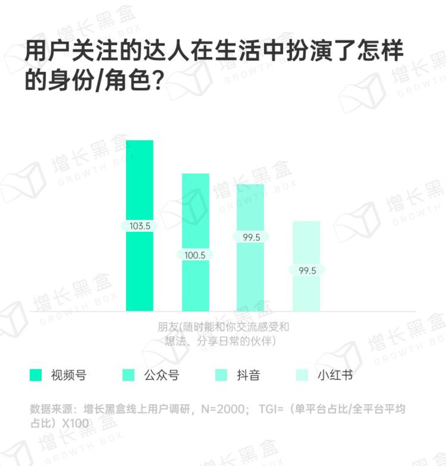 我们对于达人的形象做了一个分类,包含:朋友、导师/专家、意见领袖、灵感来源、娱乐提供者、榜样/偶像,并对比了各个平台对于达人形象的偏好程度(TGI)。