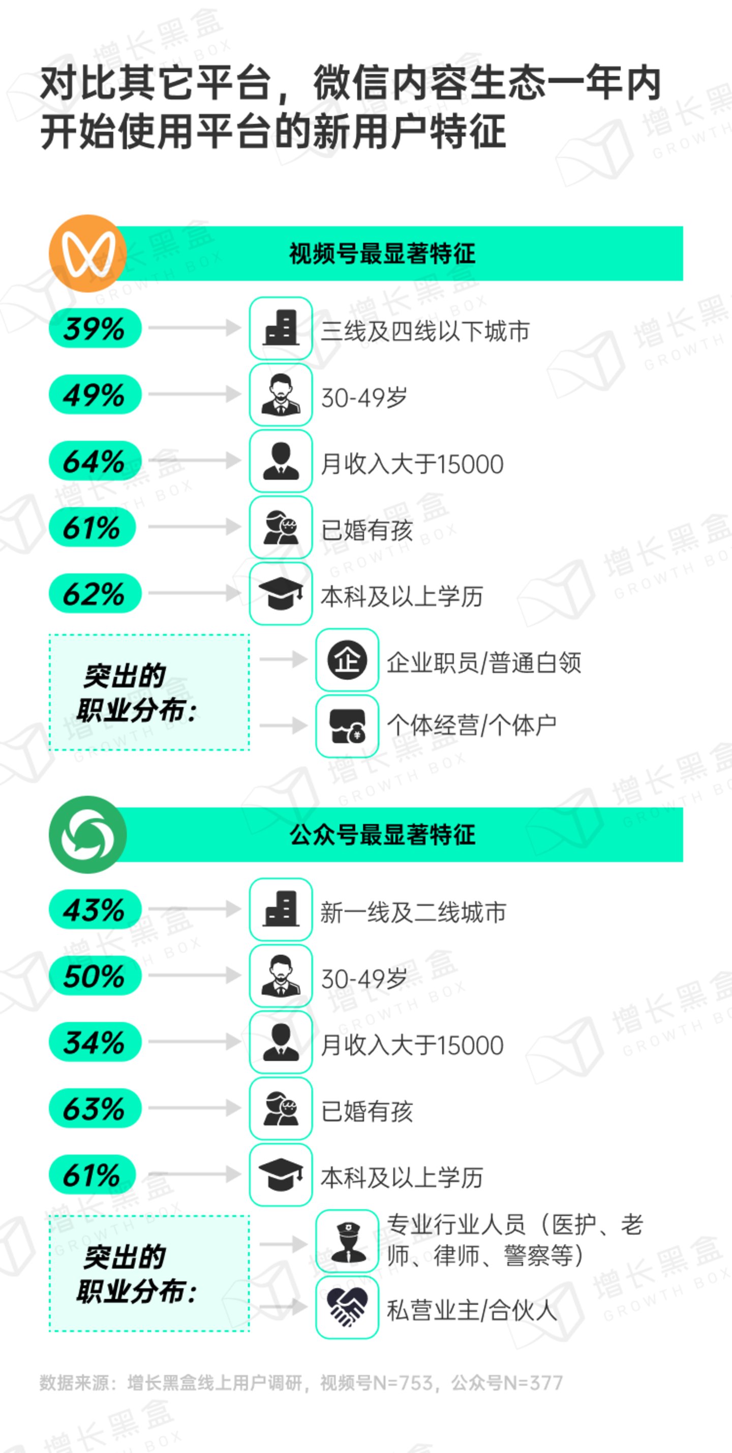 对比其它平台,视频号与公众号最近一年上手的新用户: