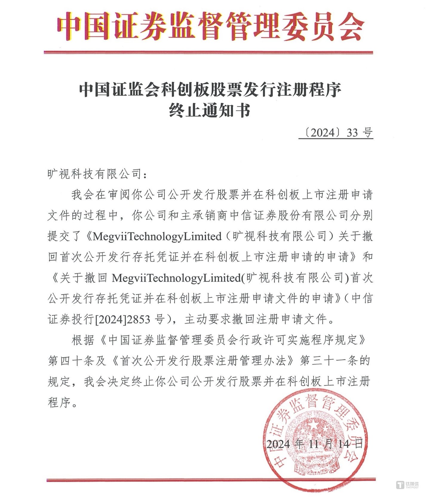 钛媒体App 11月29日消息,据上交所官网,AI 公司旷视科技主动要求撤回注册申请文件,根据《中国证券监督管理委员会行政许可实施程序规定》第四十条及《首次公开发行股票注册管理办法》第三十一条的规定,中国证监会决定终止旷视公开发行股票并在科创板上市注册程序。
