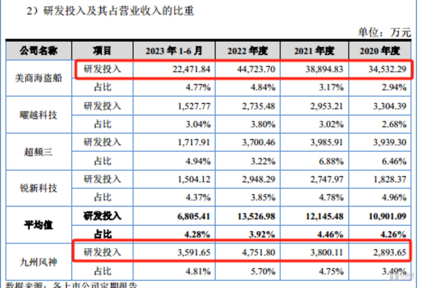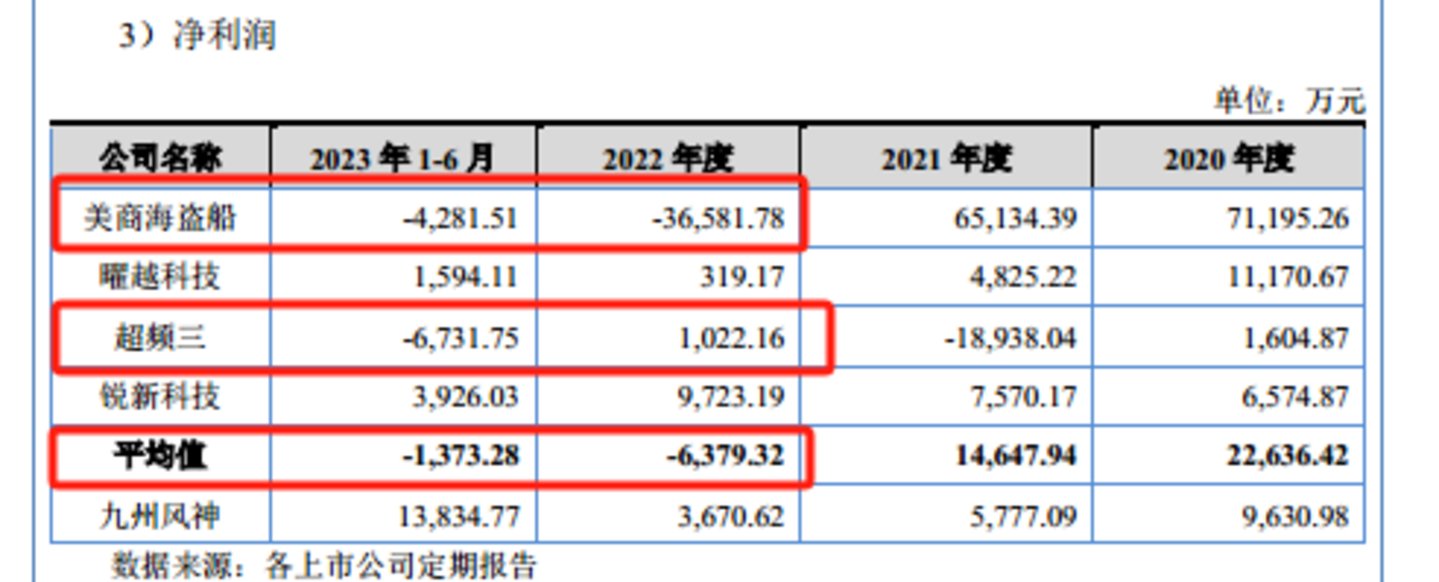 需要指出的是,如此翻天覆地的业绩波动,其合理性或值得商榷。九州神风在申报稿中披露,其同行可比公司分别为美商海盗船、曜越科技、超频三、锐新科技,上述公司2020年-2022年和2023年1-6月(下称“报告期”)的利润情况如下: