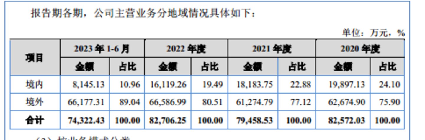 另外,九州神风的产品主要是销售至境外。报告期内,九州神风在境外产生的销售收入分别为62674.9万元、61274.79万元、66586.99万元、66177.31万元,分别占当期主营业务收入的75.9%、77.12%、80.51%、89.04%,其中俄语区为公司第一大销售区域,报告期内占主营业务收入的比例分别为22.63%、23.79%、 28.13%和41.78%。