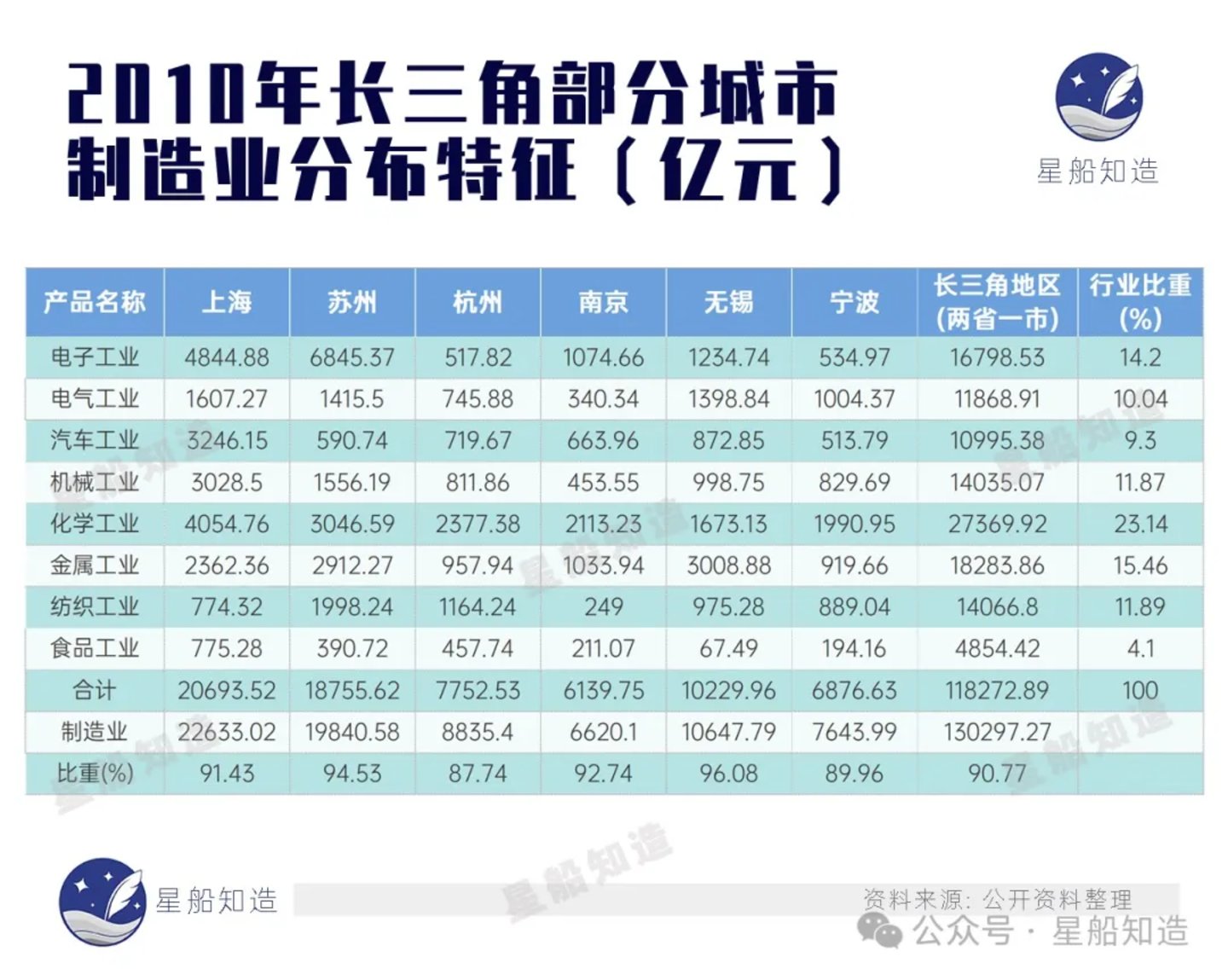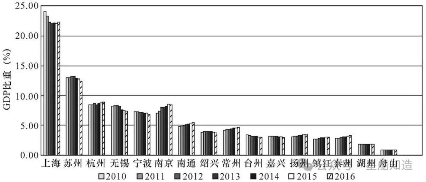 《星船知造》又找了下2010到2016年长三角核心城市的GDP比重: