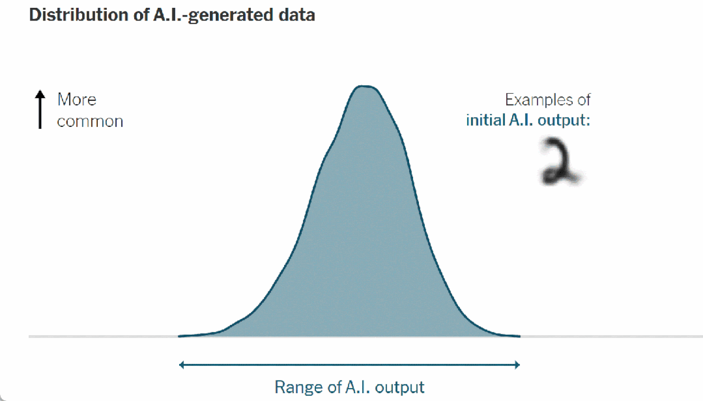 这个钟形曲线的顶点,代表着最可能的AI输出——在这种情况下,即为最典型的AI生成的数字;曲线的尾端,描述的是较不常见的输出。