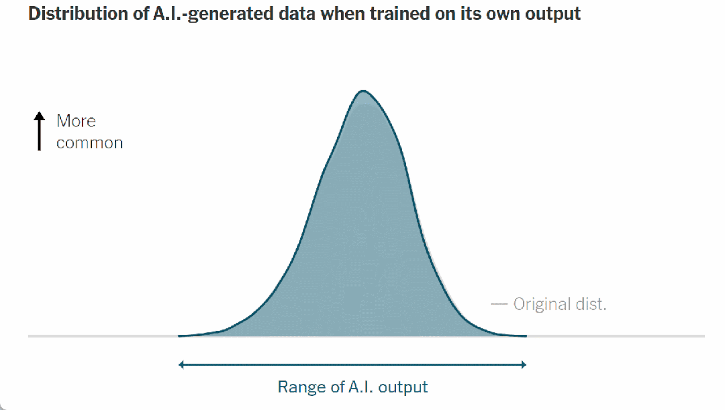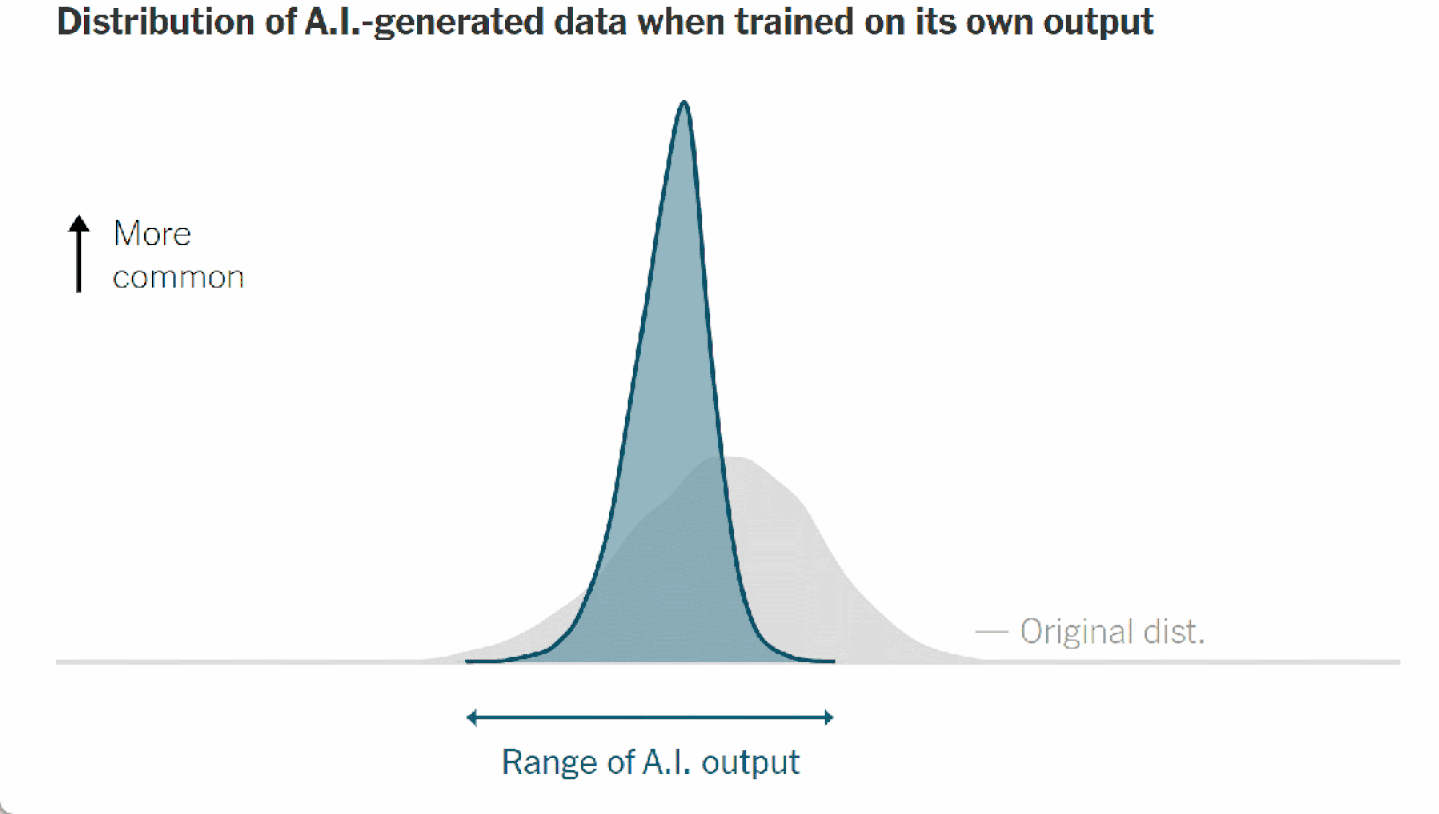 在2024年7月发表在Nature杂志上的一篇论文中[10],来自英国和加拿大的研究者们展示了这个过程如何导致AI输出范围随时间缩小——他们称此为“模型崩溃”的早期阶段。