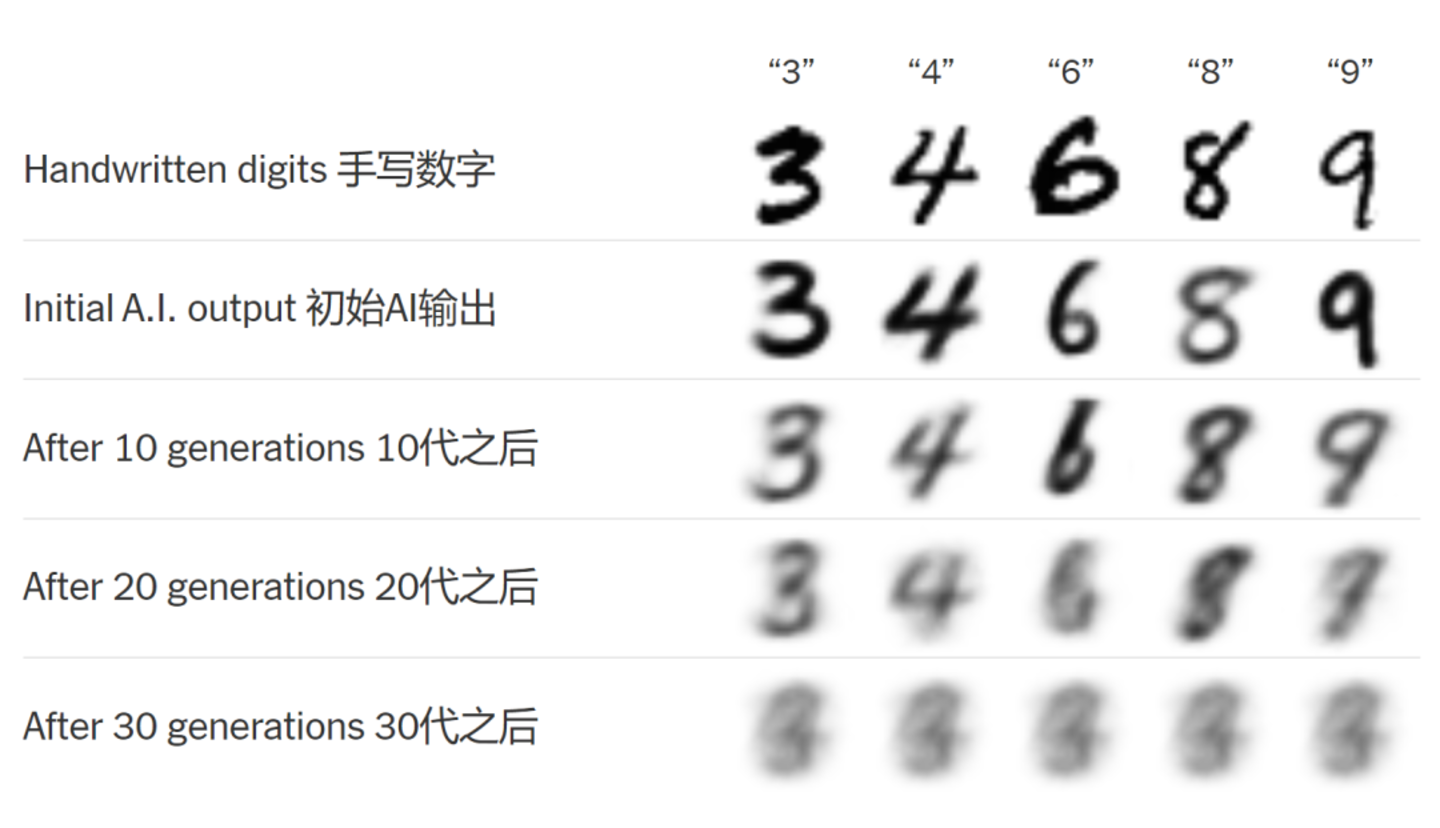 ▷图3.在AI生成的数字集上继续训练后生成的数字集,基于Ilia Shumailov 等人的研究。