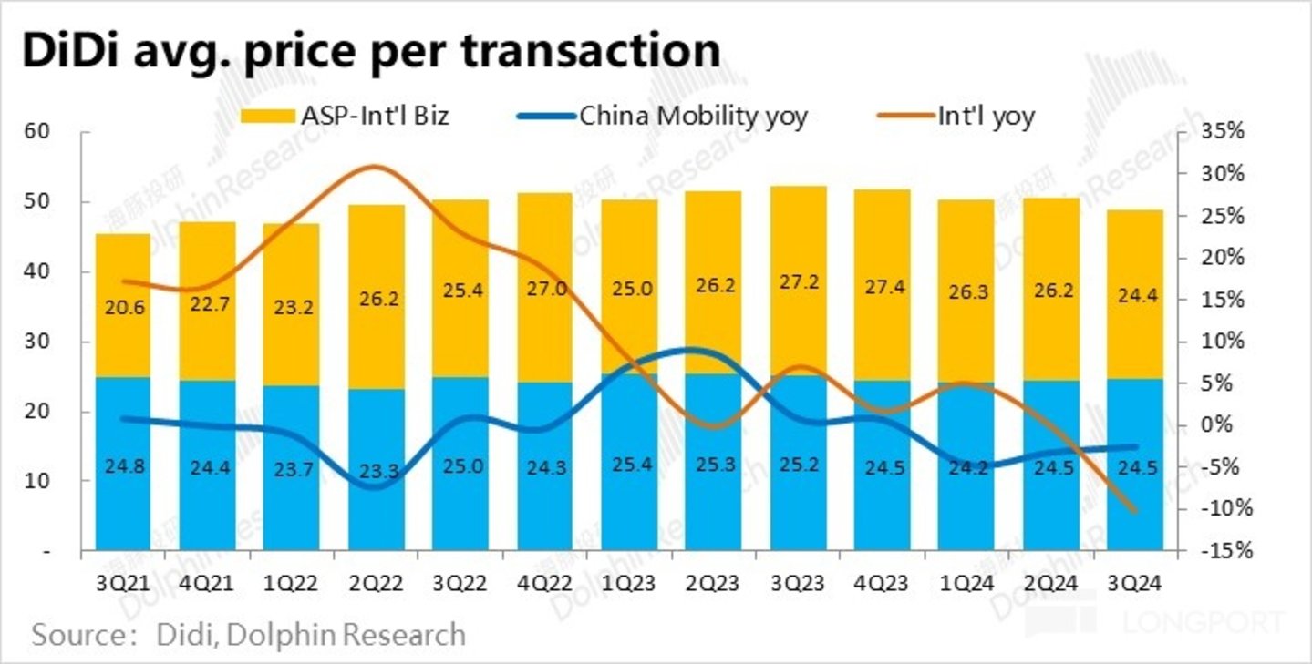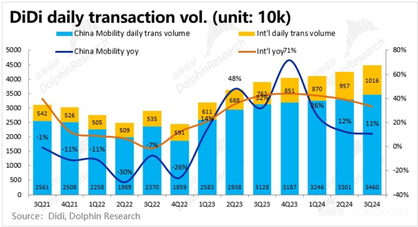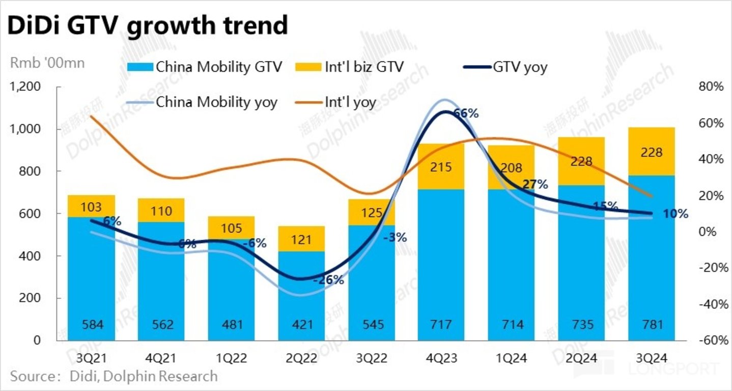 底层运营数据上,2024 三季度滴滴国内出行实现 GTV 781 亿,同比增长 7.8%,较上季大体持平、略有放缓,走出过去两年先抑后扬的波动期后,国内业务增速在向中长期的中枢靠拢,即稍高于 GDP 增速,大约 10% 左右的增速。环比角度,本季国内 GTV 增长了 6.3%,对比 23 年和 19 年同期的 7.2% 和 8.1%,今年 3 季度的季节性增长相对偏弱,这和零售、酒旅等体现出的宏观环境变化是一致的。