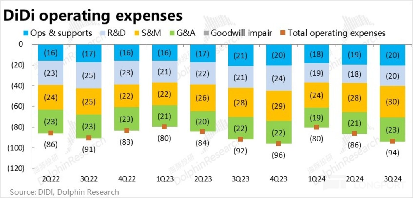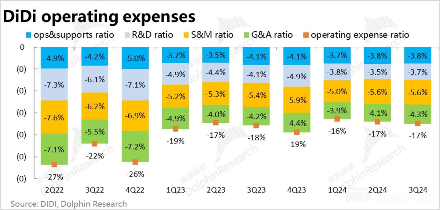 可见滴滴本季利润率的改善基本是来自于毛利端,虽然我们缺乏数据归因毛利率的改善的具体来源。但可以知道的是,额外的利润并非是靠控制费用支出挤出来的,而是靠业务变现能力的提升、或是收入结构的优化带来的。
