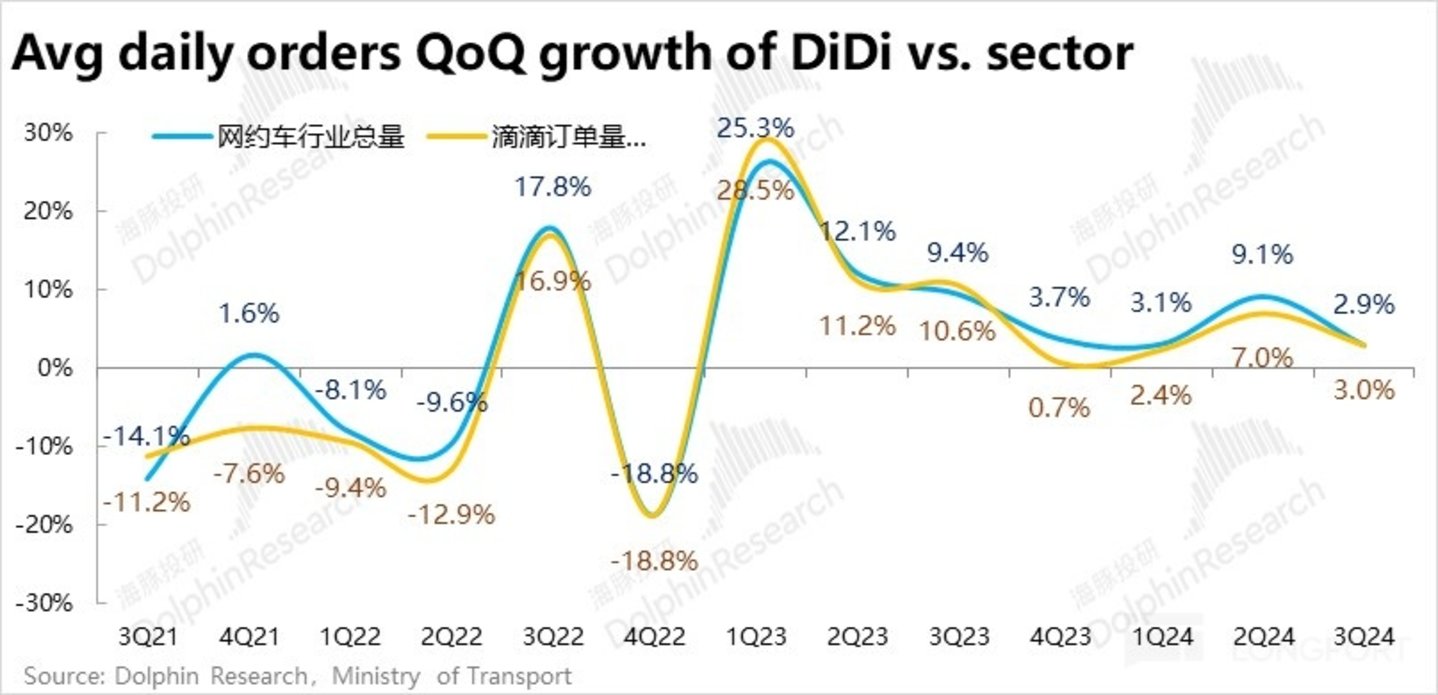 据交通部的口径,网约车行业本季整体单量是环比增长了 2.9%(注意交通部和滴滴自身披露的单量口径并不一致)。交通部口径下的滴滴国内网约车单量(不包含花小猪、顺风车以及聚合业务),则是环比增长了 3%。