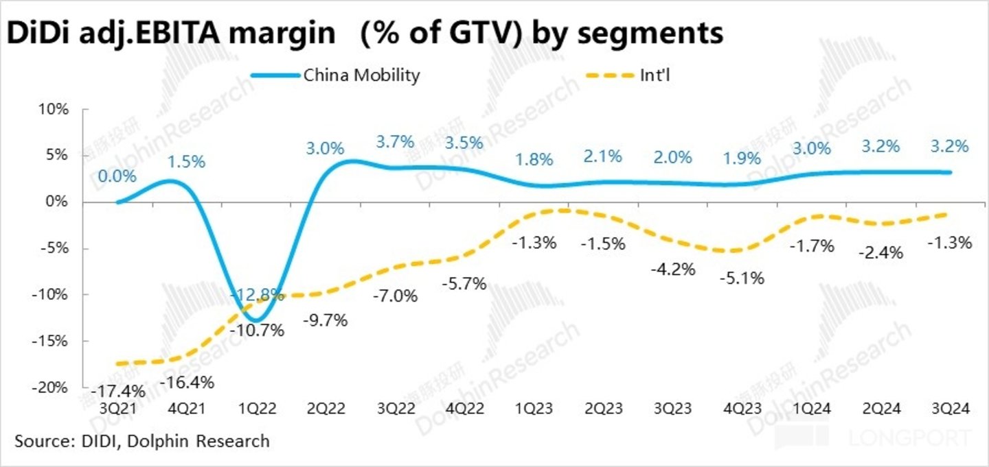 滴滴整体本季的 adj.EBITA 达 17.4 亿,环比增长 37%,虽然占大头的国内板块利润率已走平,靠其他板块的减亏仍是挤出不少的利润。