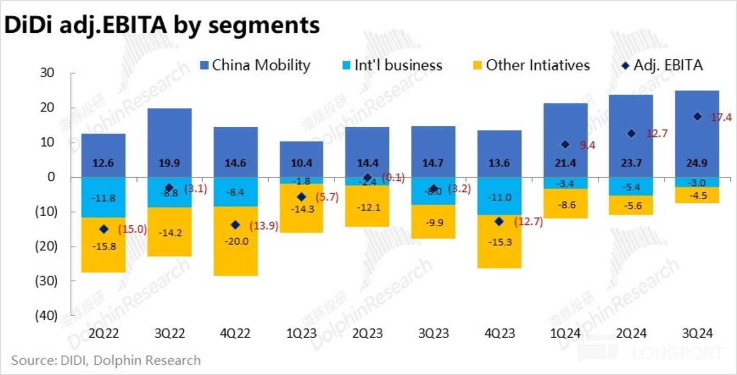 因此滴滴整体本季的 adj.EBITA 达 17.4 亿,环比增长 37%,虽然占比最大的国内板块利润环比仅仅略增,靠其他板块的减亏仍是能挤出不少的利润。