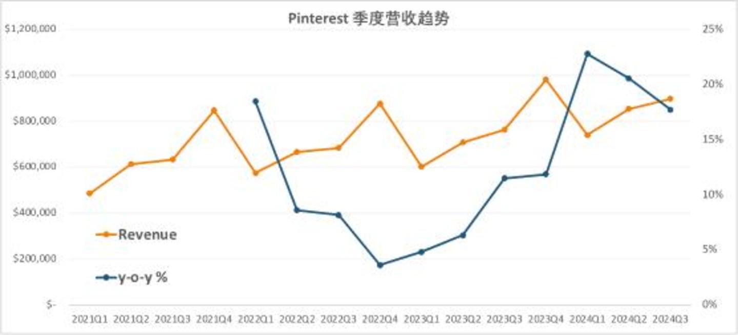 Pinterest同样受益于大模型技术实现业绩增长的公司,从2023年开始营收同比再次加速,2024年三季度营收同比增长了17.7%,2024年三个季度营收接近25亿美元,预计2024年全年相比2023年增长5亿美元左右。