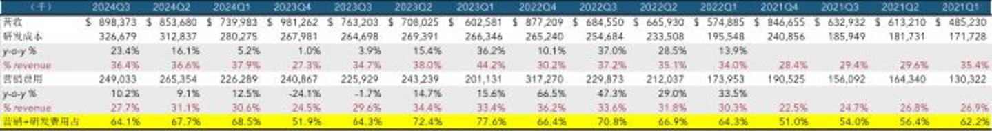 虽然大模型助力下广告收入重新加速增长,但Pinterest依然处于运营亏损状态。这当中的主要问题在于居高不下的研发成本,对于社交平台来说市场营销费用是维护新用户体量的重要手段不可或缺,Pinterest每个季度的市场投入占收入的比例在30%左右。