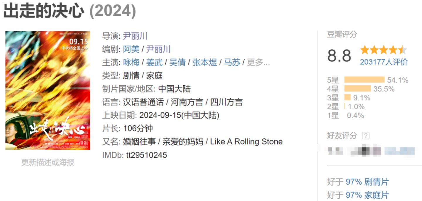 《出走的决心》导演尹丽川此前最知名的履历,是担任过张艺谋执导的《山楂树之恋》的编剧。而她根据真实事例改编的《出走的决心》,讲述了一个中老年女性为何在50岁这年选择出走的故事,豆瓣开分8.9,之后一度冲上9分,现如今虽滑落到8.8分,但在剧情片领域,也是国产片年度top2。