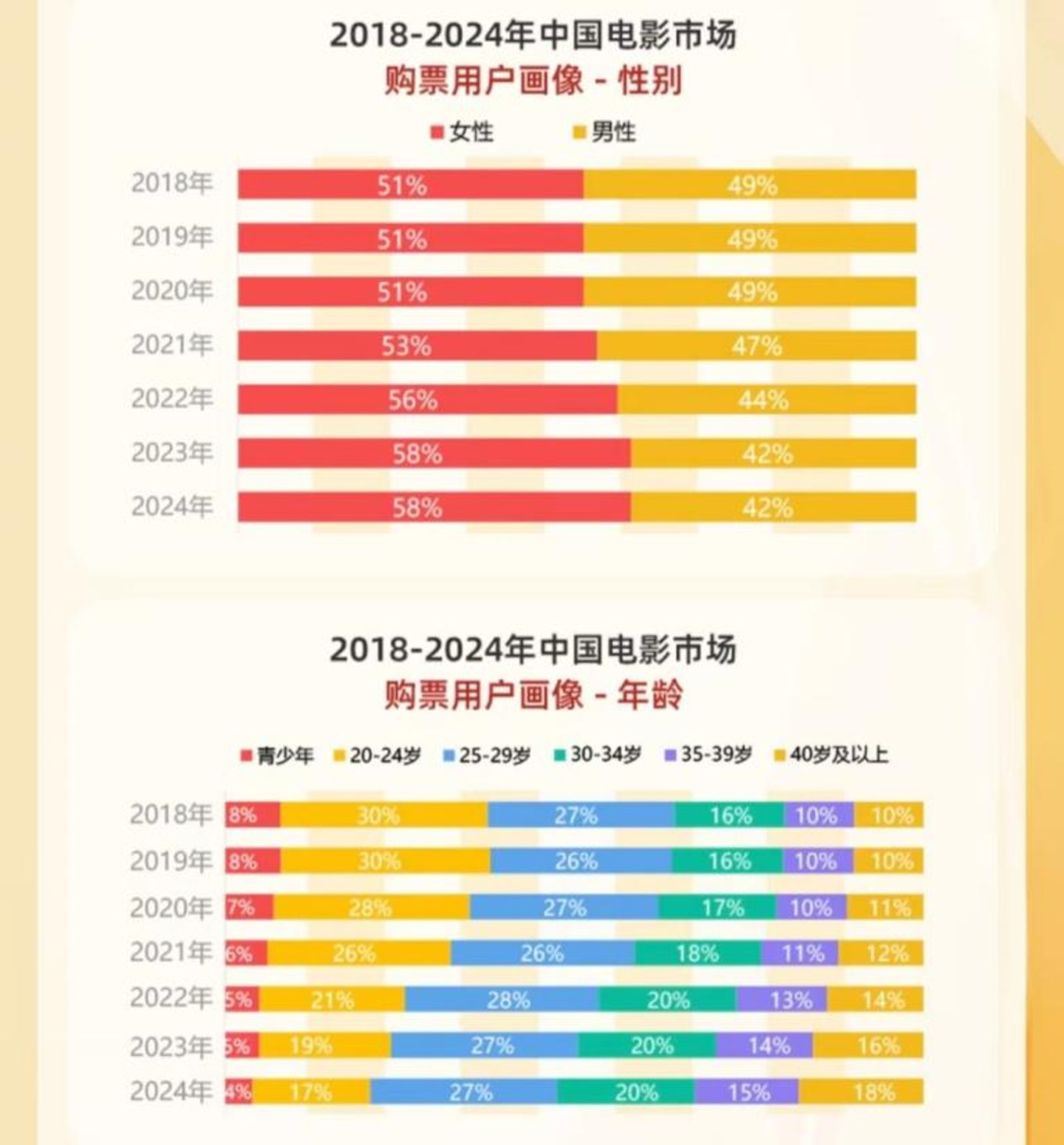 灯塔出品的《2024中国电影观众变化趋势报告》显示,截至2024年10月,女性购票占比58%,25岁及以上观众占比79%,女性以及95后观众逐渐成为市场主力。