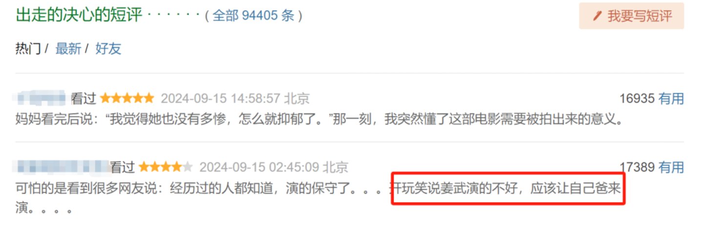 翻看国内的社交平台,不管是影迷群体为主的豆瓣,还是年轻女性为主的小红书,或受众更广泛、更下沉的抖音,在《出走的决心》下显著提到的一句话是:姜武演得很好,但没我爸演得好。