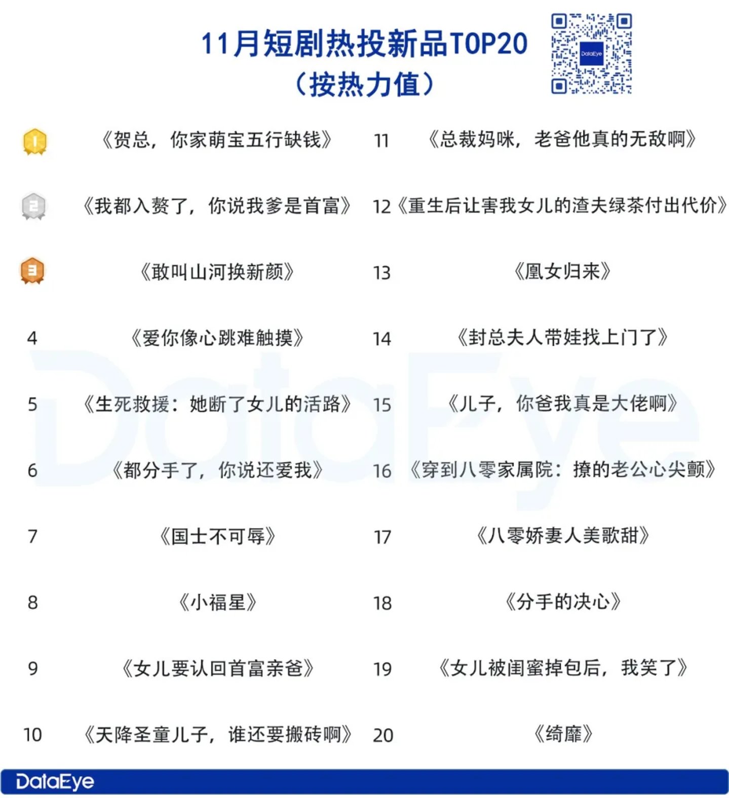 11月DataEye短剧新品榜(按热力值),番茄的《贺总,你家萌宝五行缺钱》登顶,花生《我都入赘了,你说我爹是首富》第二,麦芽《敢叫山河换新颜》位列第三。