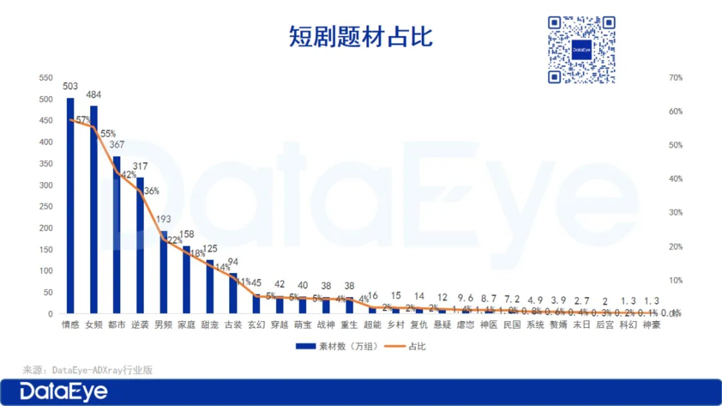 从占比来看,情感和女频题材占比均超55%,都市和逆袭题材占比则分别为42%和36%。其余题材占比均在30%以下。