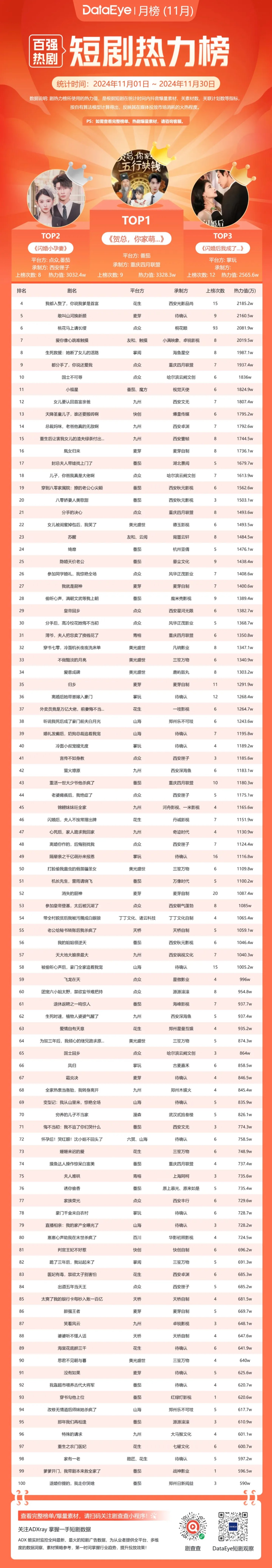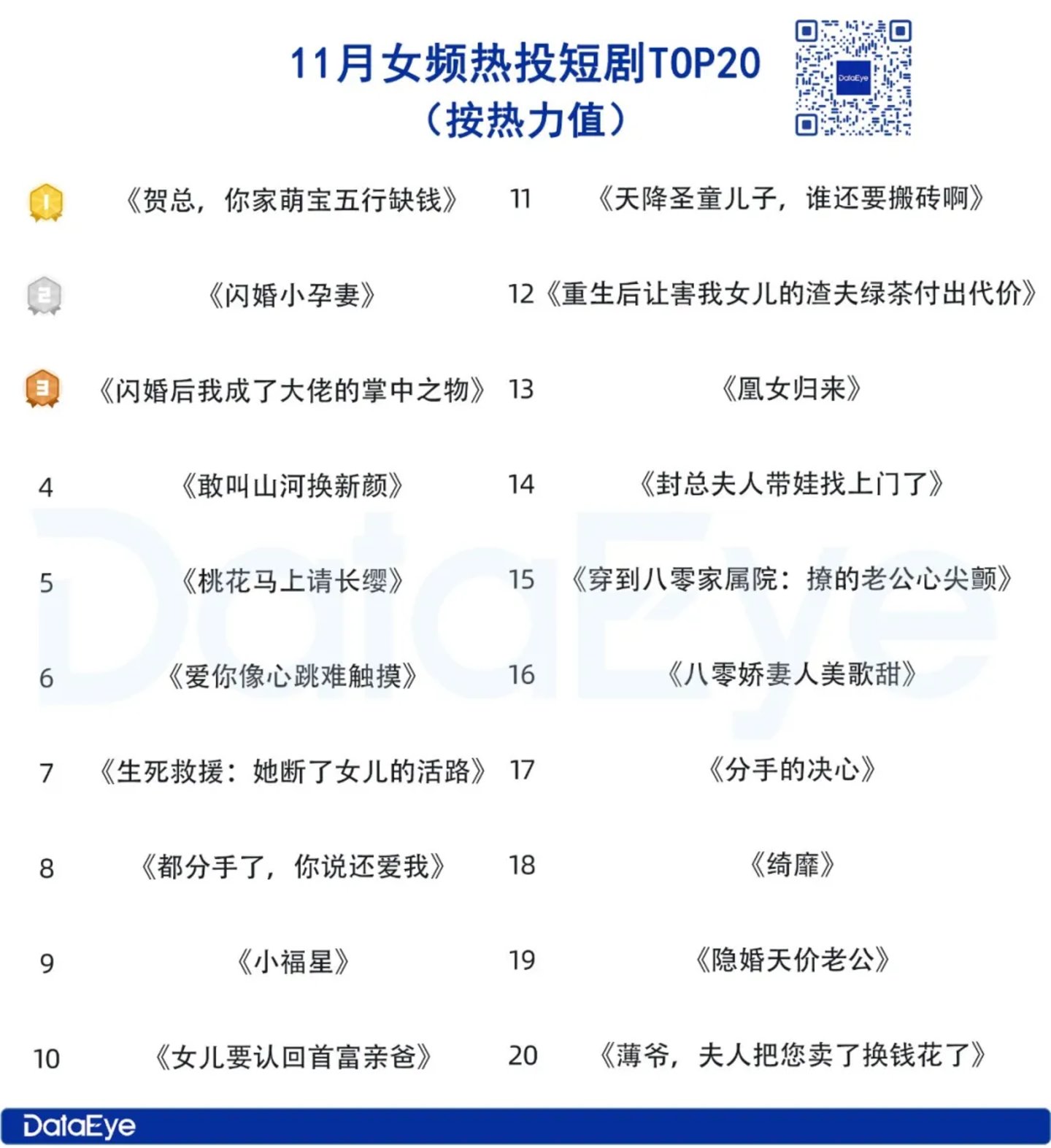 2、11月男频/女频热投短剧TOP20:萌宝题材热度上涨,老剧热度居高不下