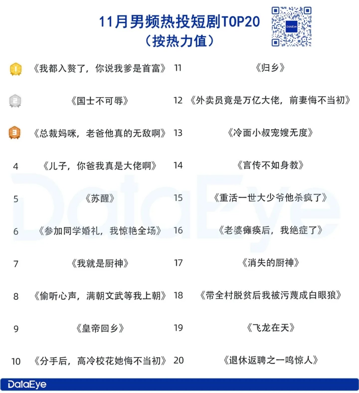 11月男频热投短剧中,花生《我都入赘了,你说我爹是首富》登顶,点众《国士不可辱》第二,九州《总裁妈咪,老爸他真的无敌啊》位列第三。共有14部新剧闯入11月男频热投短剧TOP20。