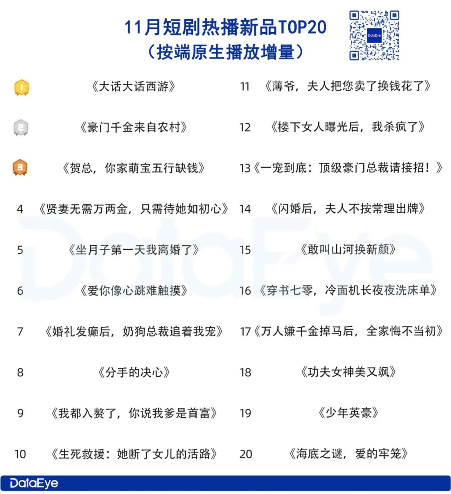 11月DataEye端原生热播新品榜中,九五二七剧场播出的《大话大话西游》登顶,成竹剧院播出的《豪门千金来自农村》第二,木兰短剧的《贺总,你家萌宝五行缺钱》第三。