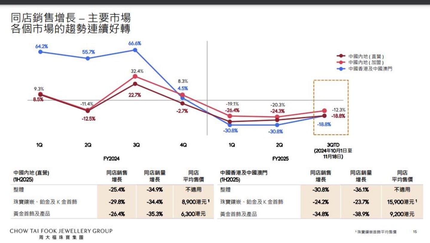而六福集团2025财年第二季度(2024年7月1日至9月30日)整体零售值同比下降16%,同店销售额同比下降35%,门店净减少了76家。