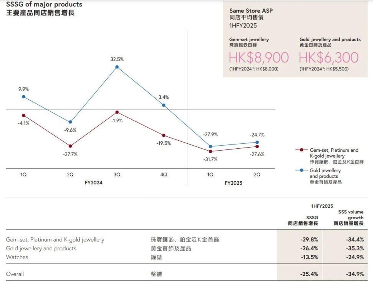 但是,金价的持续走高,也让中国内地整体同店销售额同比下降了25.4%,同店销量同比下降34.9%。