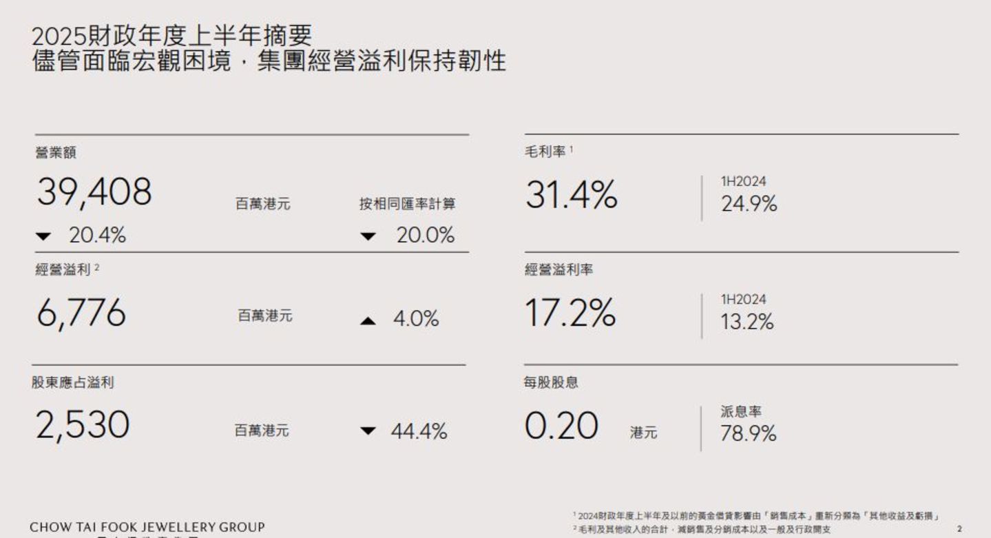 根据周大福珠宝集团发布的2025财年度半年业绩报告,截止到9月30日的6个月内,周大福珠宝实现营收394.08亿港元,同比下滑20.4%;而净利润为25.30亿港元,同比下跌44.4%,接近“腰斩”;每股收益由0.46港元跌至0.25港元。