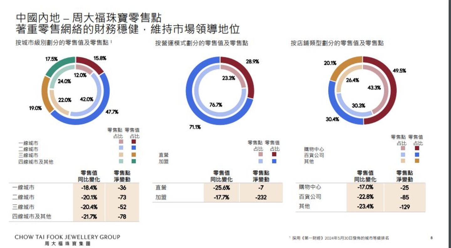 根据财报,2025年上半年周大福珠宝在内地市场上关闭了239个零售点。其中,直营门店净关闭了7家,加盟店净关闭了232家。可以看出,在渠道上面的调整和优化基本都是在加盟商身上。
