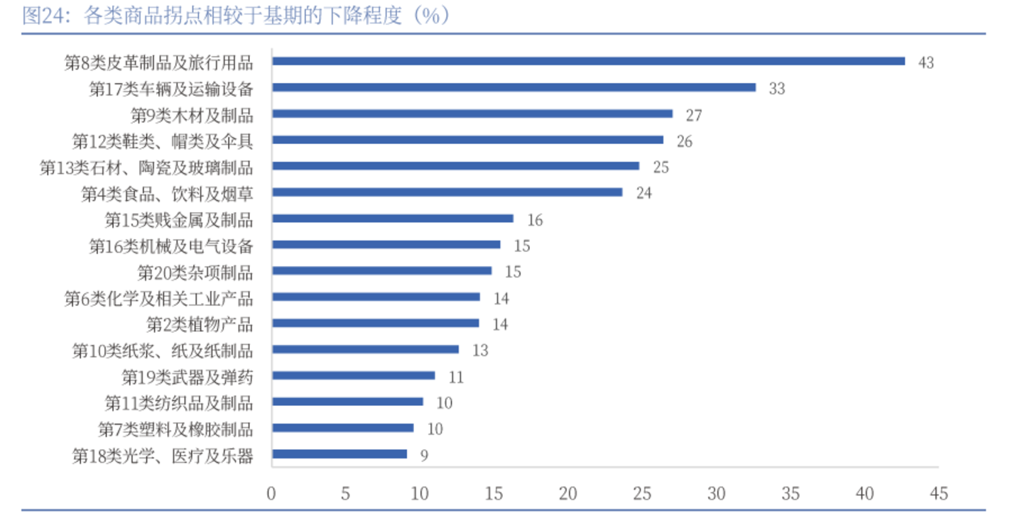 其中,平价美妆产品消费者对价格敏感度高,品类所受的影响可参照食品饮料等消费类产品,这些品类受关税影响较基准下降幅度为24%,下降周期约15个月,随后进入修复周期(中国银河证券);