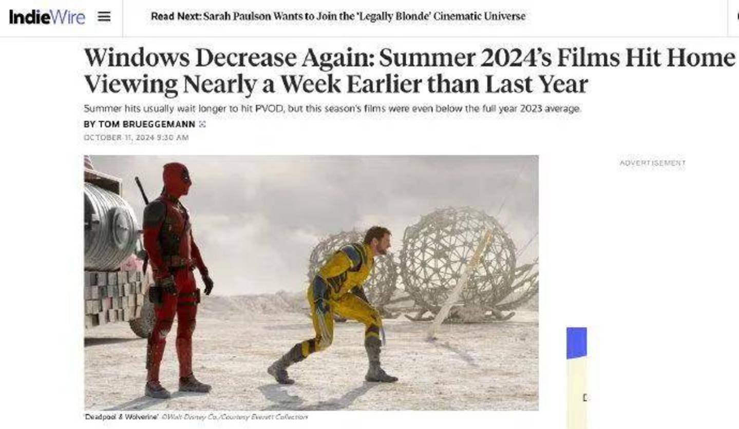 根据IndieWire的最新统计数据显示,2024年好莱坞暑期电影的院线窗口期平均为35天,较去年同期的41天减少了近一周。