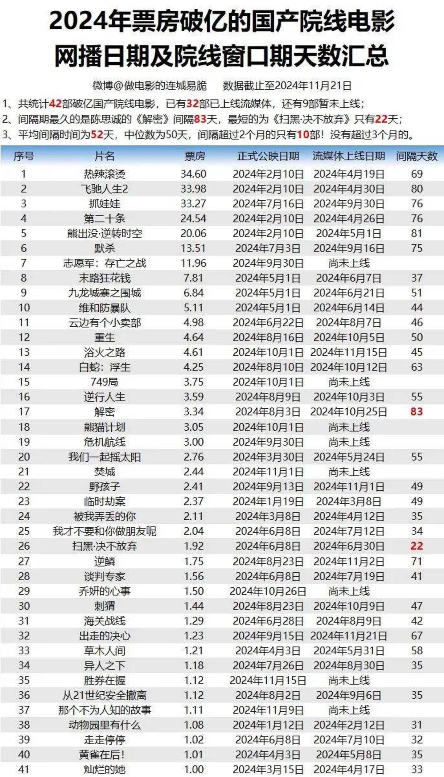 以今年的头部电影为例,《热辣滚烫》《抓娃娃》《第二十条》《熊出没·逆转时空》《默杀》等一批高票房影片的网播窗口期均达到了两个月以上,陈思诚导演的《解密》窗口期则达到了83天,为今年影片中最长。