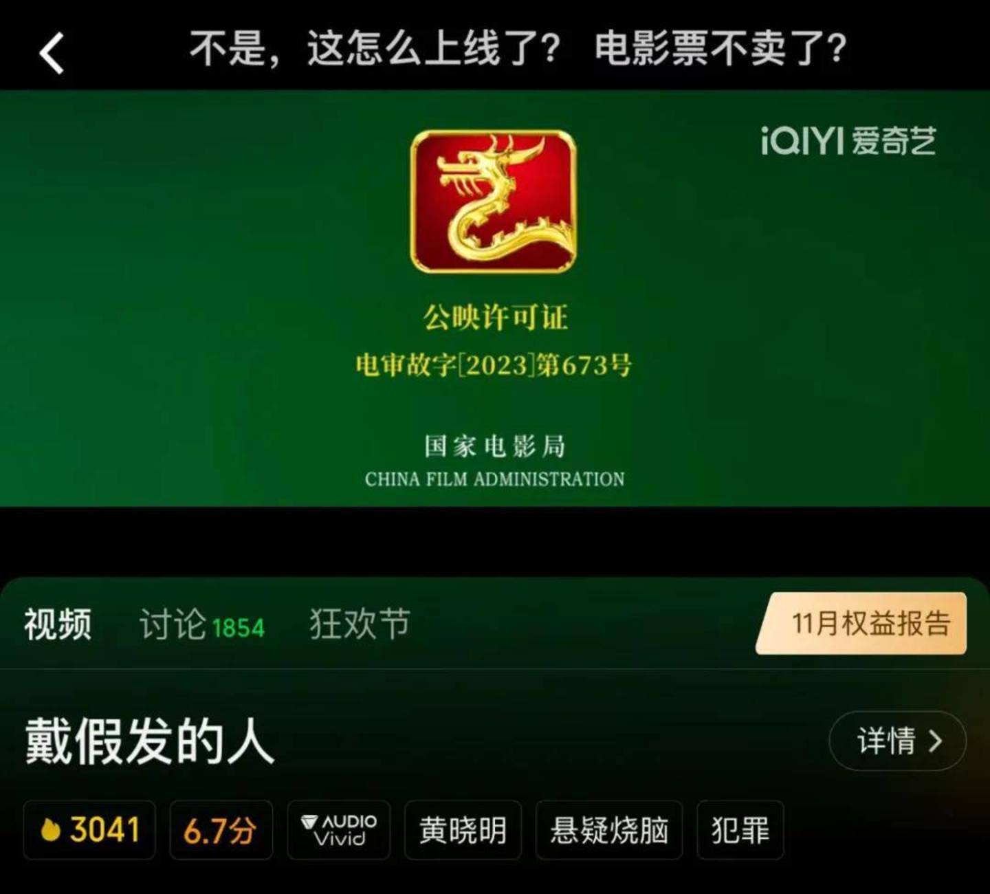 于11月16日上映的黄晓明主演新片《戴假发的人》在上映一周后的11月23日便登陆视频平台网播。而那一天,这部影片的累计票房仅有413万元。在影片开始网播后,尽管院线密钥还未过期,但已经处于了“事实下映”的状态,截至目前,该片的总票房只有420万。