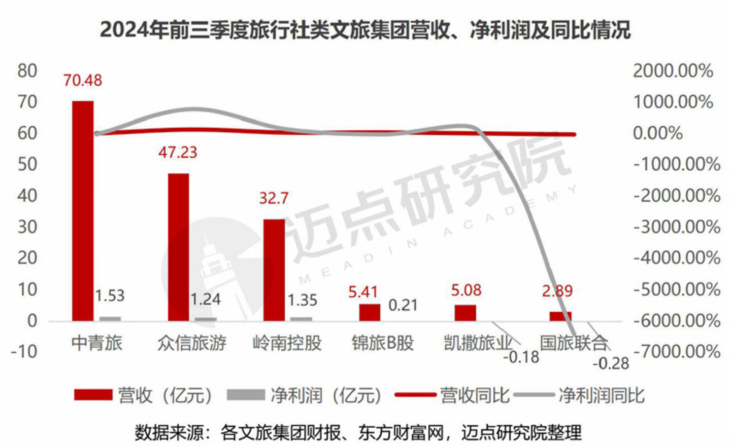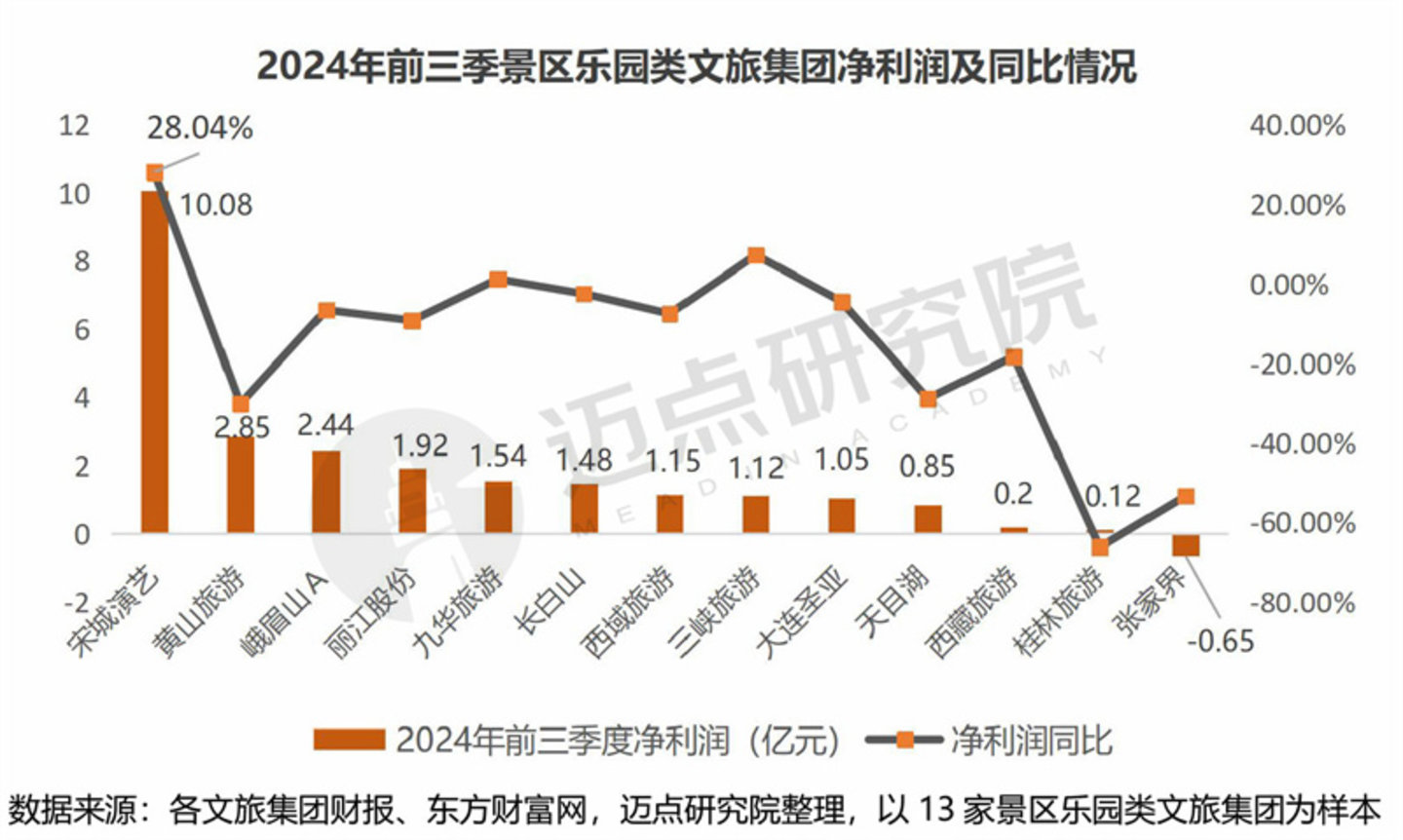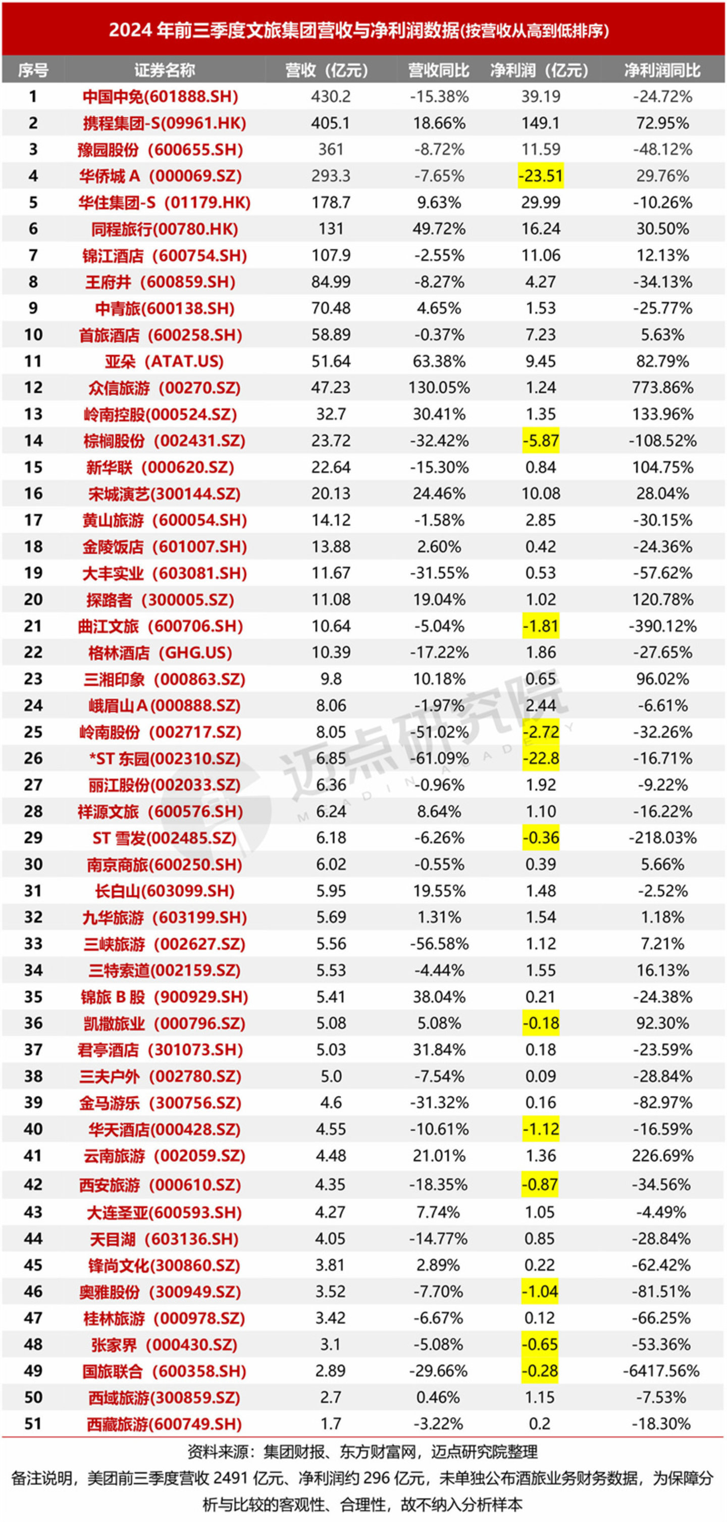 与全国文旅市场的人气旺盛、热点与亮点文旅事件频现、文商体旅深度融合等相对应,以文旅上市公司为代表的文旅集团亦交出较为亮眼的“成绩单”:前三季度,超四分之三的企业实现盈利,且以携程集团-S、同程旅行、宋城演艺、众信旅游、岭南控股、锦江酒店等为代表的部分企业前三季度净利润已超越其2023全年水平,盈利能力表现优异;从增速方面看,51家文旅集团中,营收正增长的21家、净利润正增长的18家、“双增长”的11家,可见,其业绩分化、增速放缓等特征较为凸显。