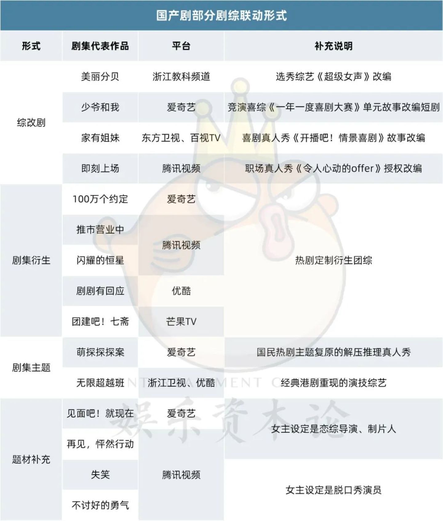 “但算不上联动,因为真正有综艺授权玩改编的非常少,还是把综艺题材当成一种创意元素放在影视剧里。”制片人大牛告诉娱乐资本论(id:yuelezibenlun)。