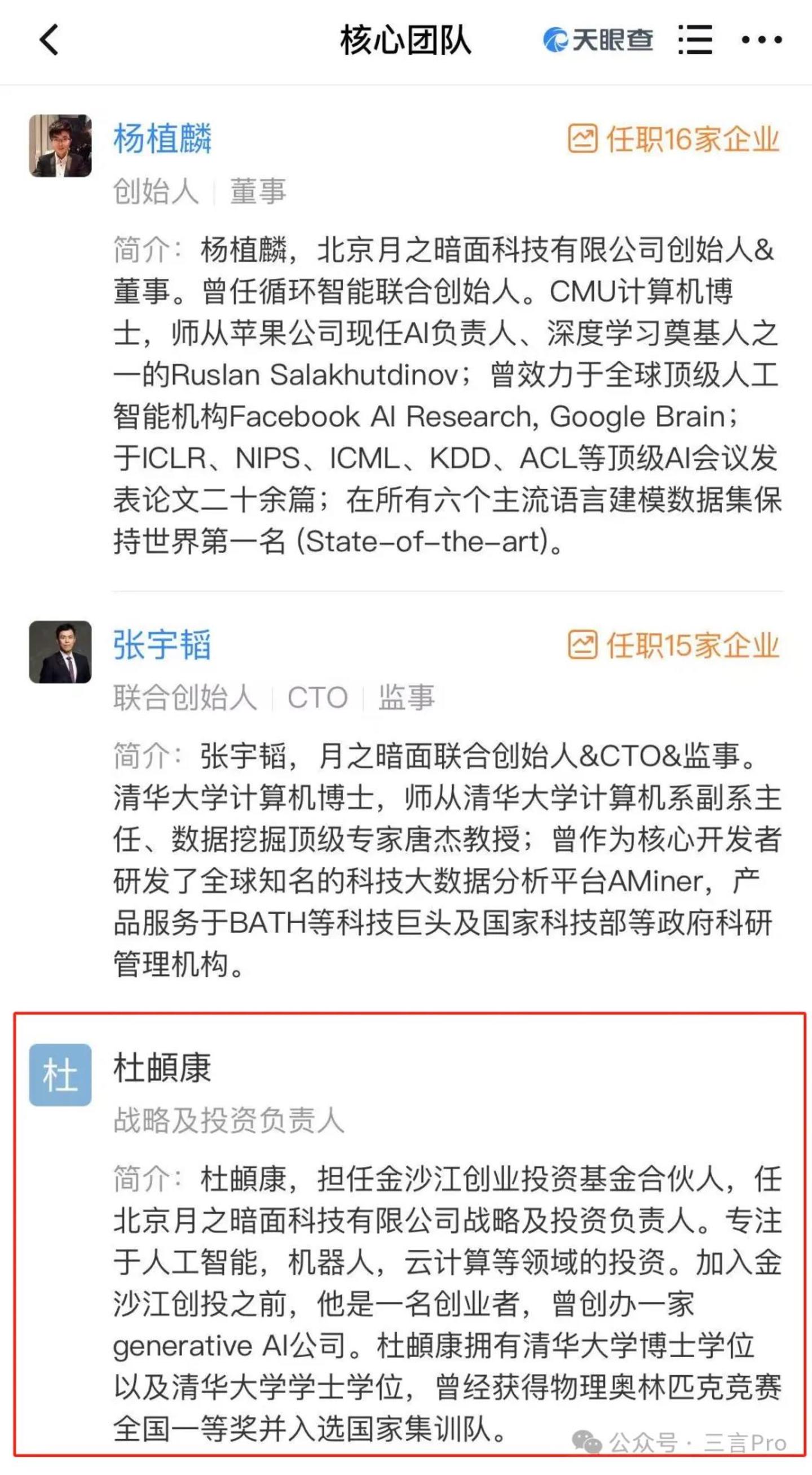 资料显示,月之暗面的核心团队中,“战略及投资负责人”是金沙江创业投资基金合伙人杜頔康。