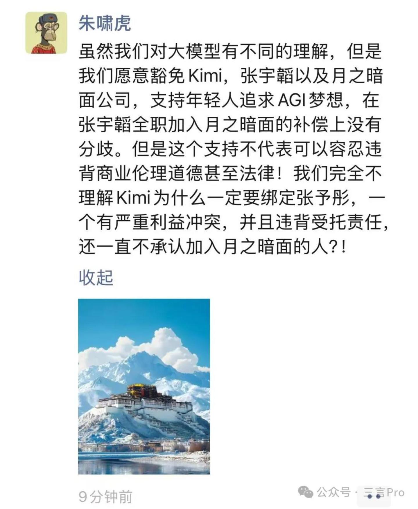 之后,朱啸虎再次在朋友圈发文:“虽然我们对大模型有不同的理解,但是我们愿意豁免Kimi,张宇韜以及月之暗面公司,支持年轻人追求AGI梦想,在张宇韜全职加入月之暗面的补偿上没有分歧。但是这个支持不代表可以容忍违背商业伦理道德甚至法律!我们完全不理解Kimi为什么一定要绑定张予彤,一个有严重利益冲突,并且违背受托责任,还一直不承认加入月之暗面的人?”