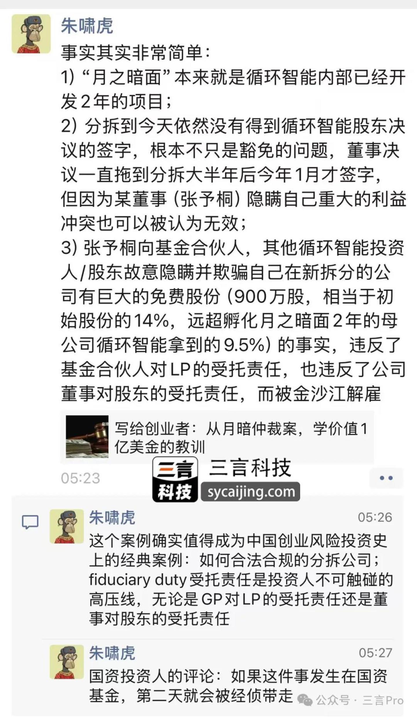 此外,朱啸虎在朋友圈转发的《写给创业者:从月暗仲裁案,学价值1亿美金的教训》一文中写道:“据圈内人士透露,杨植麟出去创业的时候,直接给了循环智能接近10%的股份,循环智能到现在都是月之暗面的最大股东之一。”