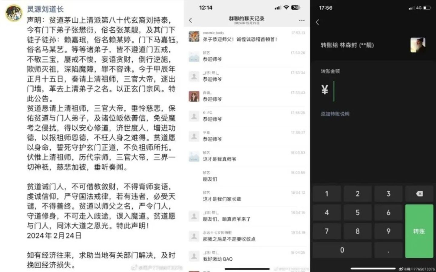 还有人爆料,这位女道士及其徒弟曾因诈骗被她的师傅公开发声明革除弟子之名,随后她注册了小号冒充其师傅师父进群,继续造谣行骗。