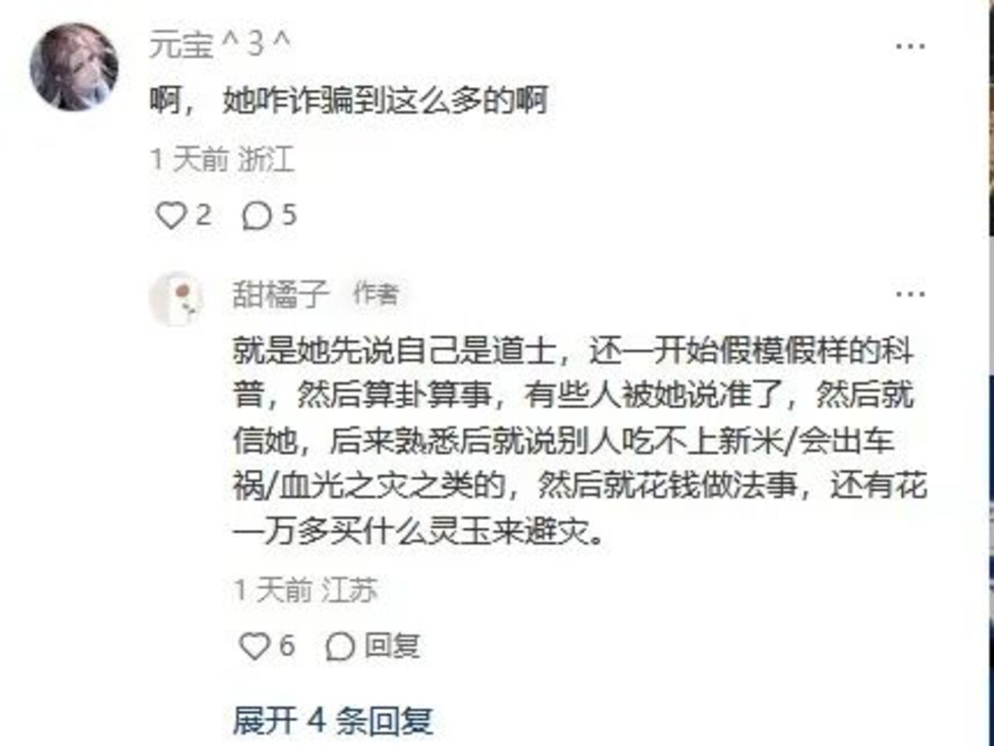 有网友发现,这名狂热粉丝在追柏林护士前,就已经用道士的身份行骗两年之久,期间一直在自己的“客户群”内行骗。通常,她会先科普自己的道士身份,再帮群员算卦,熟悉后就开始以“会出车祸”、“血光之灾”等话术忽悠群员花钱做法事,买玉佩辟邪。