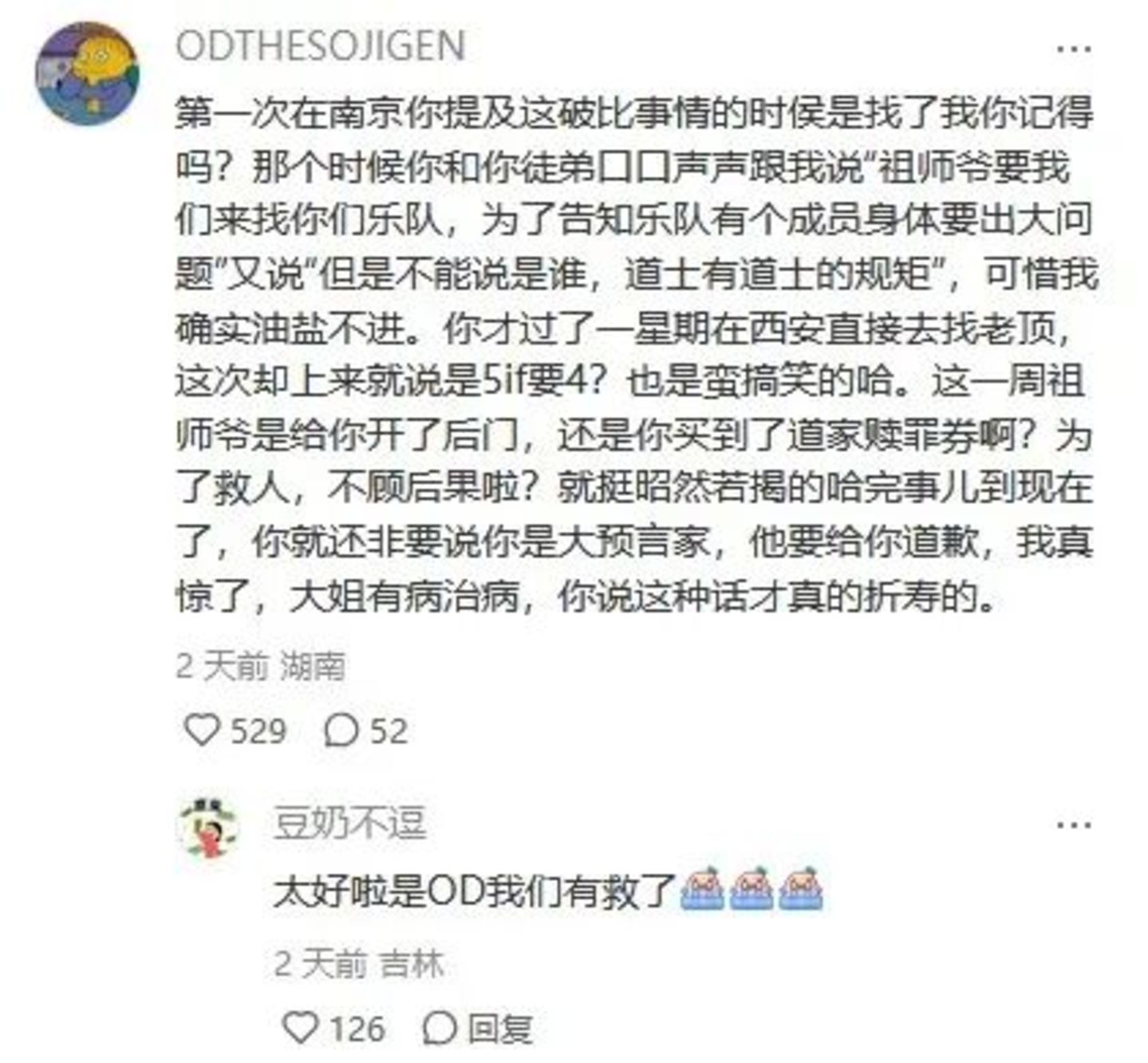 另一边,在这位道士的回应中,自己似乎是一个理智粉,仅因为其道士的特殊身份,善意提醒主唱伍一夫身体有巨大的健康隐患,而遭到乐队误解。
