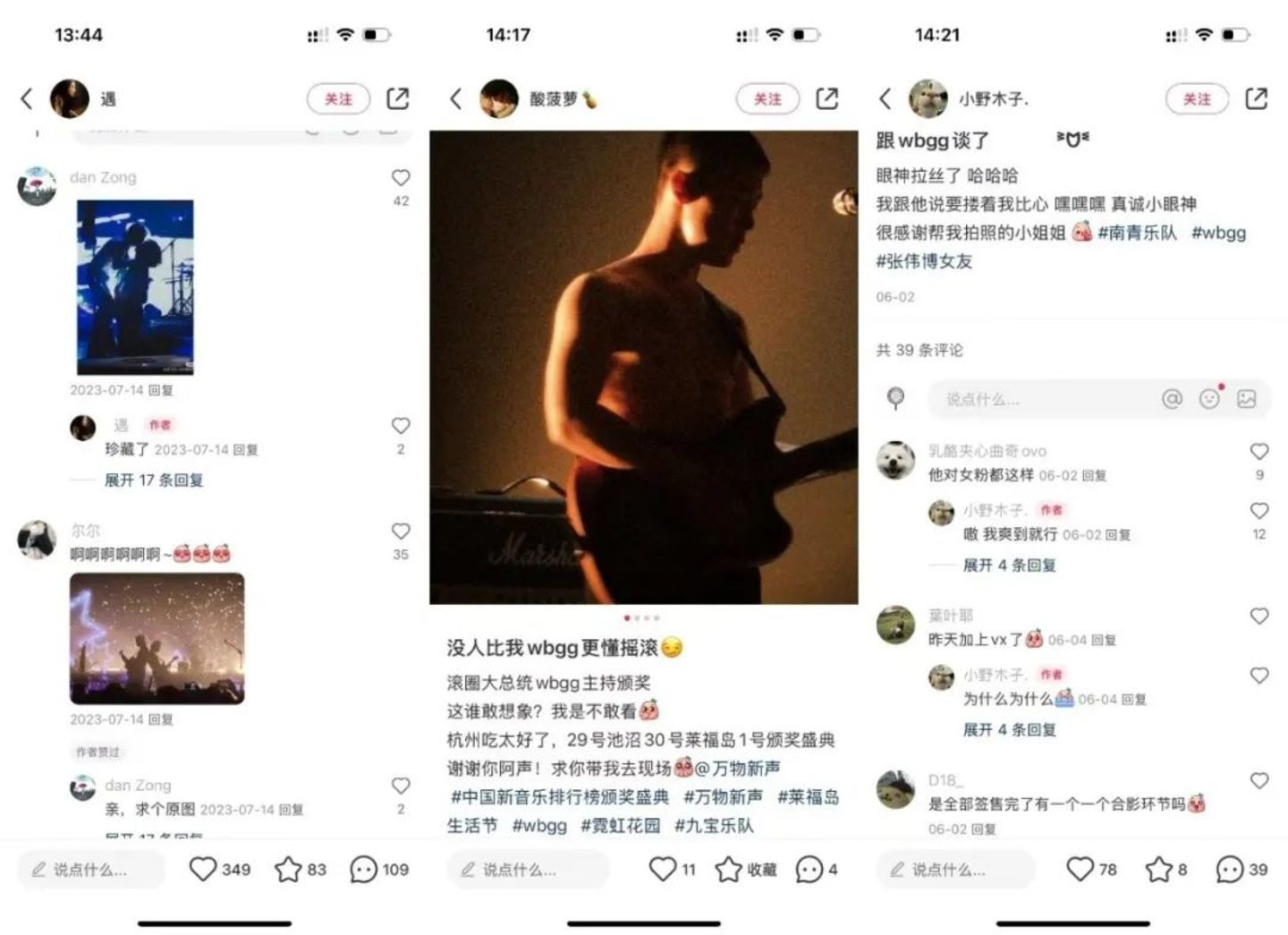 比如,南青/赞诗乐队主唱张伟博、回春丹、旅行团等乐队都难逃“梦女化”凝视,对音乐人的讨论早已超出音乐本身,更多聚焦于他们的穿搭、长相乃至性格特质。演出后,社交媒体讨论的主要话题也从“现场编曲有何改动”、“新歌的歌词表达了怎样的情绪”,变成了“主唱今天戴的帽子真的很潮”、“贝斯手的冷酷气质好迷人”、“我老公”、“我俩谈了”等等。