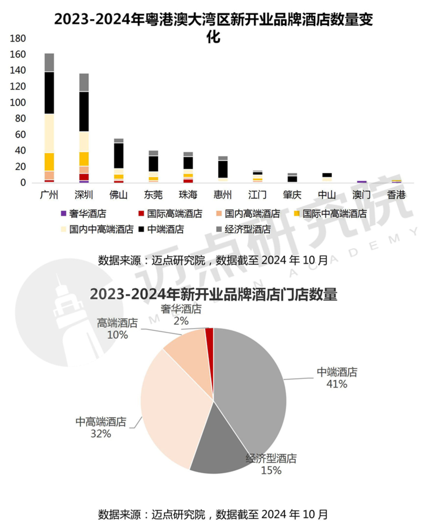 从新开业酒店类型来看,粤港澳大湾区新开业的中高端、高端、奢华酒店品牌门店数量合计占比62%。这一比例显示出大湾区对高品质酒店需求的强劲增长。尤其是广州和深圳这样的核心城市,吸引了大量高端酒店品牌的入驻。此外,随着大湾区基础设施的完善和区域一体化进程的推进,大湾区的旅游吸引力也在不断增强,进一步促进了高端酒店市场的发展。