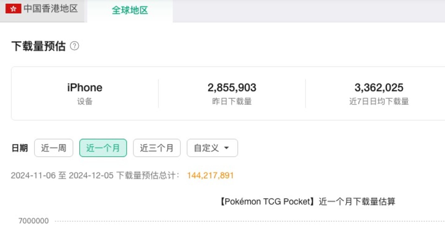 截至12月6日,七麦数据显示:《Pokémon TCG Pocket》iphone端全球单月预估下载量超1.44亿次。11月7日,宝可梦公司联合腾讯游戏天美工作室推出竞技手游《宝可梦大集结》。