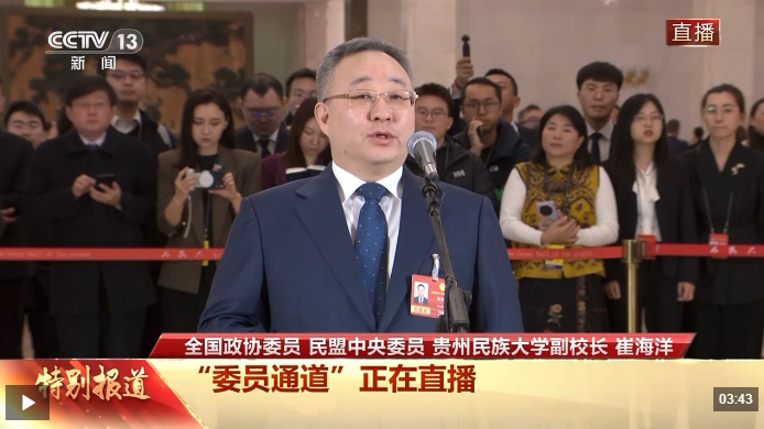 3月11日上午,全国政协十四届四次会议第三场“委员通道”在人民大会堂举行,全国政协委员、民盟中央委员、贵州民族大学副校长崔海洋接受了记者采访。
