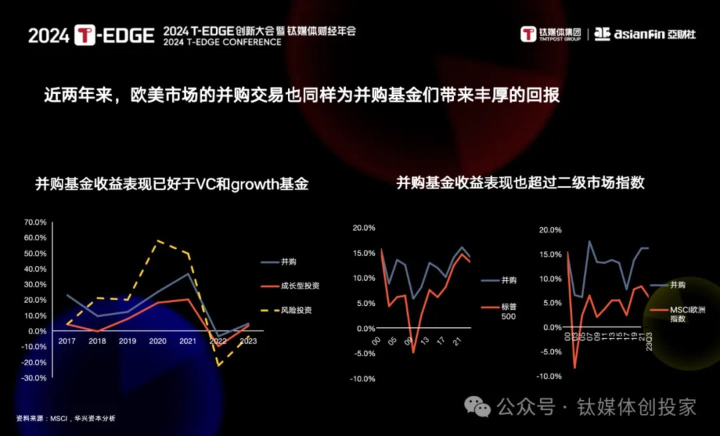 2021年之前,欧美市场泡沫比较多,所以美国VC风险投资的回报是高于并购基金的;但是从2021年开始到现在,并购基金的回报已经超过了VC投资。如果看公开市场的情况会更明显,这几年不管是美国标普还是欧洲的PME指数,并购基金的回报稳定超出公开市场的指数。